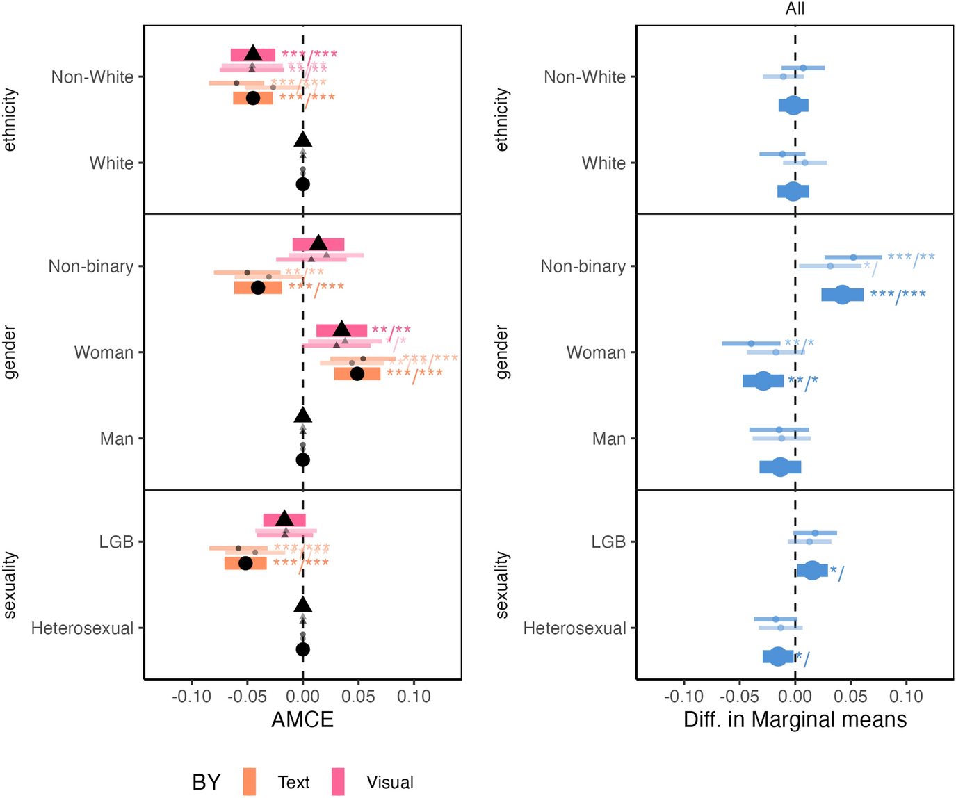 AMCE results for respondents exposed to text cues and visual cues, as well as the difference in marginal means between both, for combinations of candidates’ social categories. The wide thick line indicates the results for all respondents. The dark thin line indicates the results for respondents who did not receive party cues, while the pale thin line indicates the results for respondents who did receive party cues. Left panel represents the differential result of the marginal means of visual minus text stimuli. Regarding significance levels, two sets are reported: the first set, indicated by confidence levels, is as follows: ***p < 0.001, **p < 0.01, and *p < 0.05. The second set, appearing after the “/”, indicates significance levels adjusted by the Benjamini–Hochberg correction, maintaining the same confidence level symbols