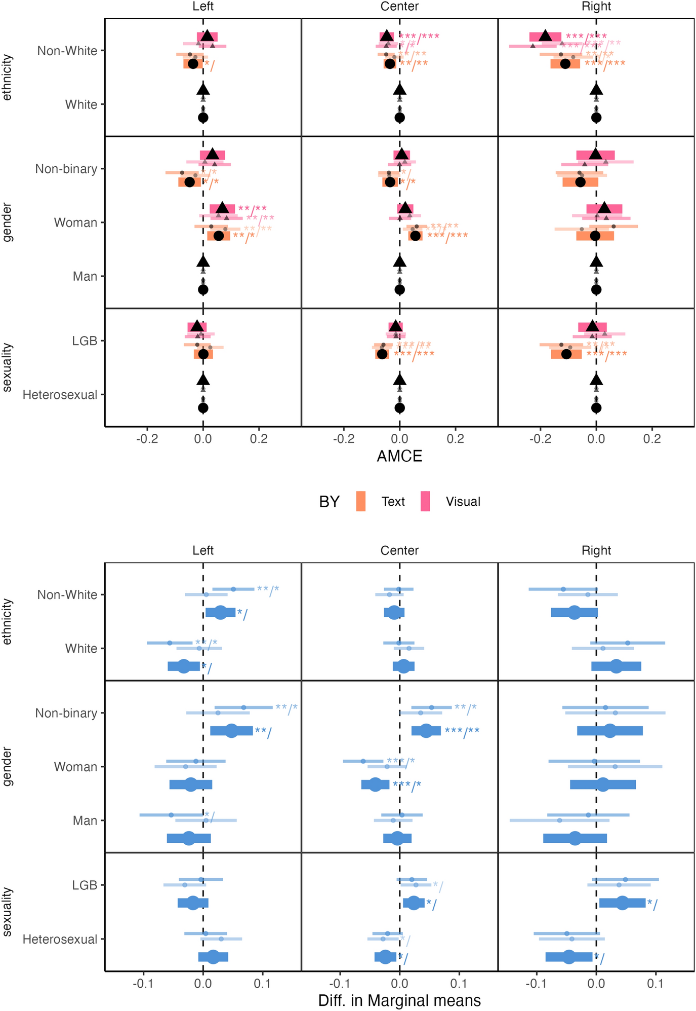 AMCE results for respondents exposed to text and visual cues, and the difference in marginal means between them, divided by ideological groups. The wide thick line indicates the results for all respondents. The dark thin line indicates the results for respondents who did not receive party cues, while the pale thin line indicates the results for respondents who did receive party cues. Left panel represents the differential result of the marginal means of visual minus text stimuli. Regarding significance levels, two sets are reported: the first set, indicated by confidence levels, is as follows: ***p < 0.001, **p < 0.01, and *p < 0.05. The second set, appearing after the “/”, indicates significance levels adjusted by the Benjamini–Hochberg correction, maintaining the same confidence level symbols