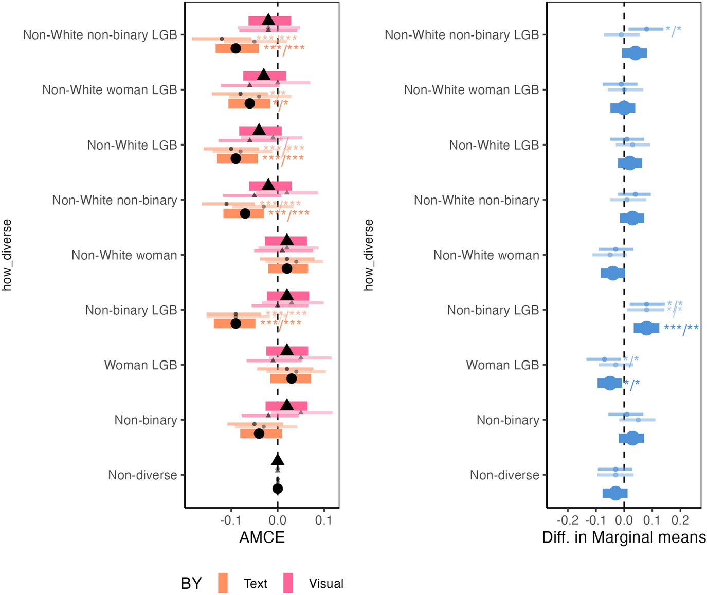 A pertinent question is what happens when social categories become intertwined. In Fig. 4 we answer this question. We find that the clearest discrimination is concentrated in candidates with threefold diversity learnt by text cues. In the case of discrimination against non-binary candidates, results show that discrimination is persistent when they are not only non-binary but also non-white or LGB. Specifically, the results report that when they are non-binary and LGB the gap between text and visual cues is significant. The results become especially interesting when the focus is placed on women with various intersections. In line the theory of motivation to control prejudice, we find that lesbian/bisexual women are viewed more negatively when their traits are specified with text than when they are specified with pictures. These findings suggest that the favorability of some women may not exist when the priming effect is left out of the equation.