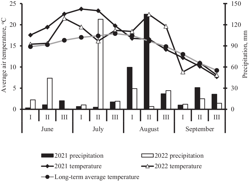 Average air temperature and precipitation on the Eerika (Central Estonia) Cannabis sativa test site in 2021 and 2022 and comparison with long-term (1964–2022) average temperature