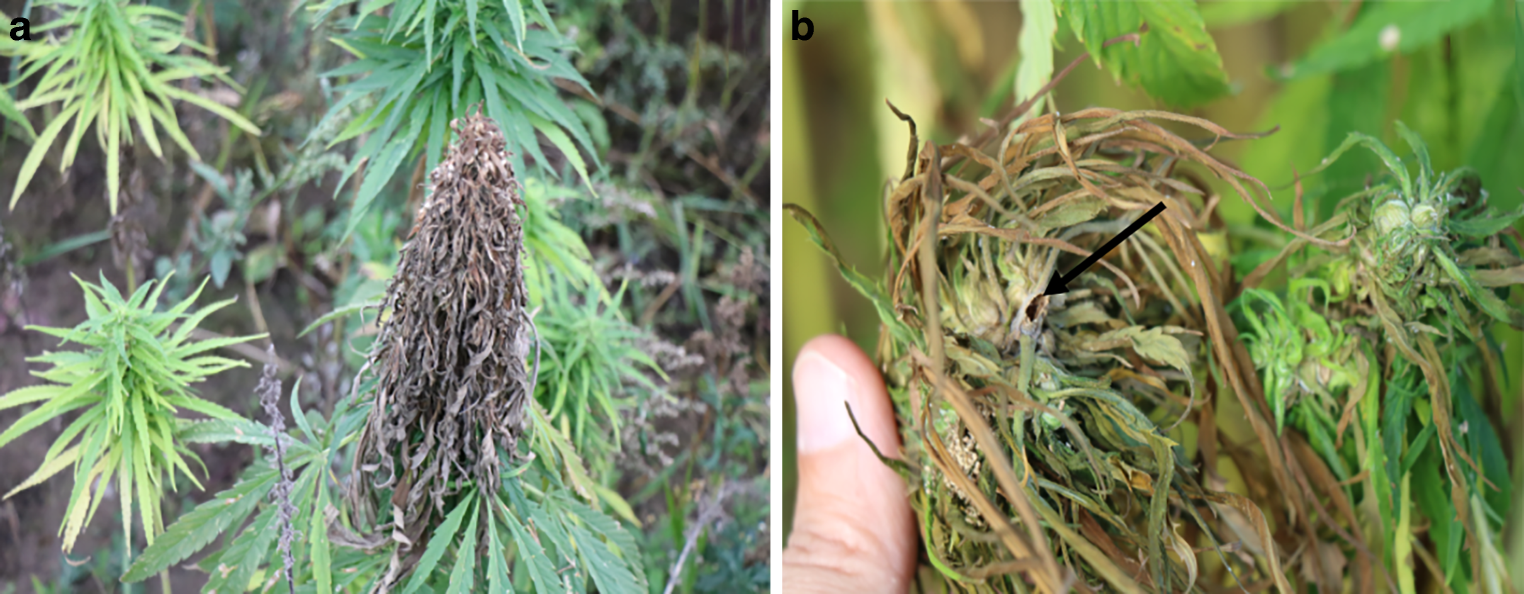 A typical hemp (Cannabis sativa) plant infested by European corn borer (Ostrinia nubilalis) in hemp field in Estonia in 2021 (a); hole in stem of hemp plant (arrow) caused by O.nubilalis (b). (Photos E. Runno-Paurson)