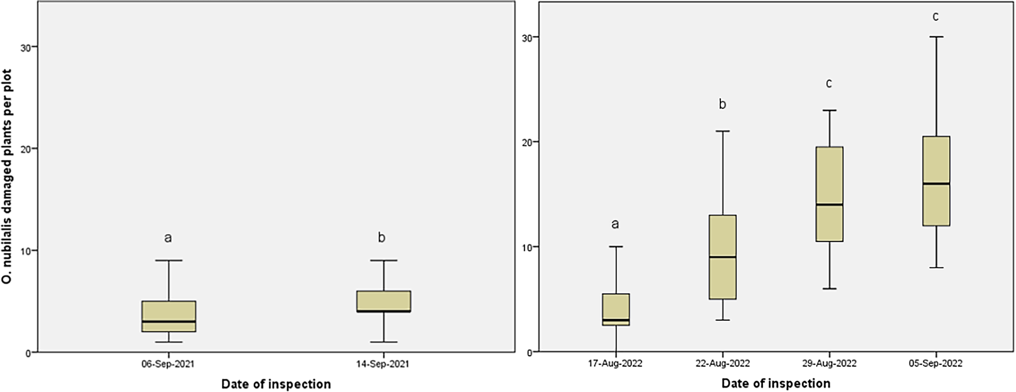 Number of O.nubilalis damaged plants per plot of cultivar ‘Finola’ in 2021 (left) and ‘Estica’ 2022 (right). Different letters (a, b, c) indicate significant differences between the groups each year (p < 0.001)