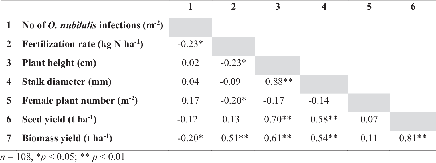 The relationships (Pearson correlations) between European corn borer (Ostrinia nubilalis) damage of industrial hemp (Cannabis sativa cv. ‘Finola’) plants and fertilization rate and plant characteristics in study year 2021