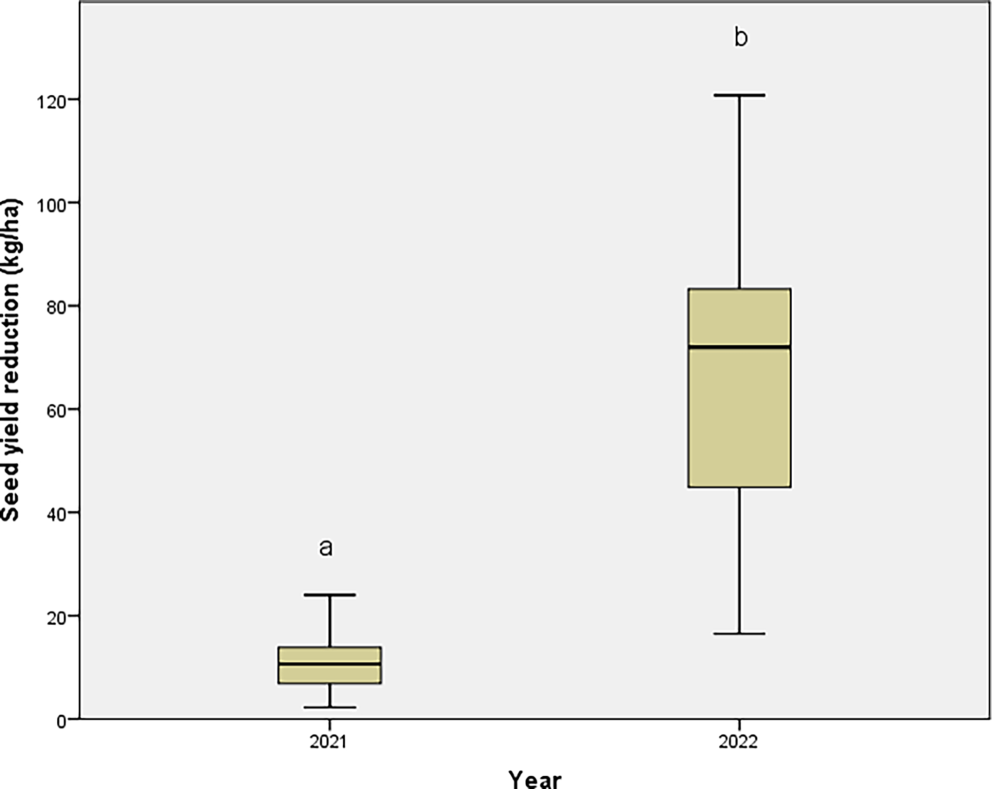 Seed yield reduction (kg ha−1) based on the number of O.nubilalis cases observed in 2021 and 2022. Different letters (a, b) indicate significant differences between observation dates (p < 0.001)