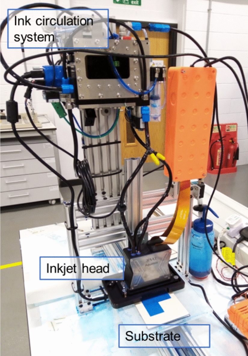 The main components of the printing system were the inkjet head, the ink management system that circulated the ink through the head and managed its temperature, and a moving platen on which the substrate was placed. The components were combined on a specially built platform (Fig. 1). The key print settings are summarized in Table 3. The ink was circulated through the print head using an HV fluid management system, Megnajet (Kettering, UK). Printing was carried out using a Xaar Aquinox GS6 drop-on-demand piezoelectric printhead provided by Xaar (Cambridge, UK). A specially constructed platen system was used, with bed movement controlled by a controller board (Duet 3 Mainboard 6HC).