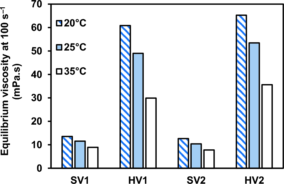 Equilibrium viscosities of inkjet inks at shear rate of 100 s−1 at various test temperatures