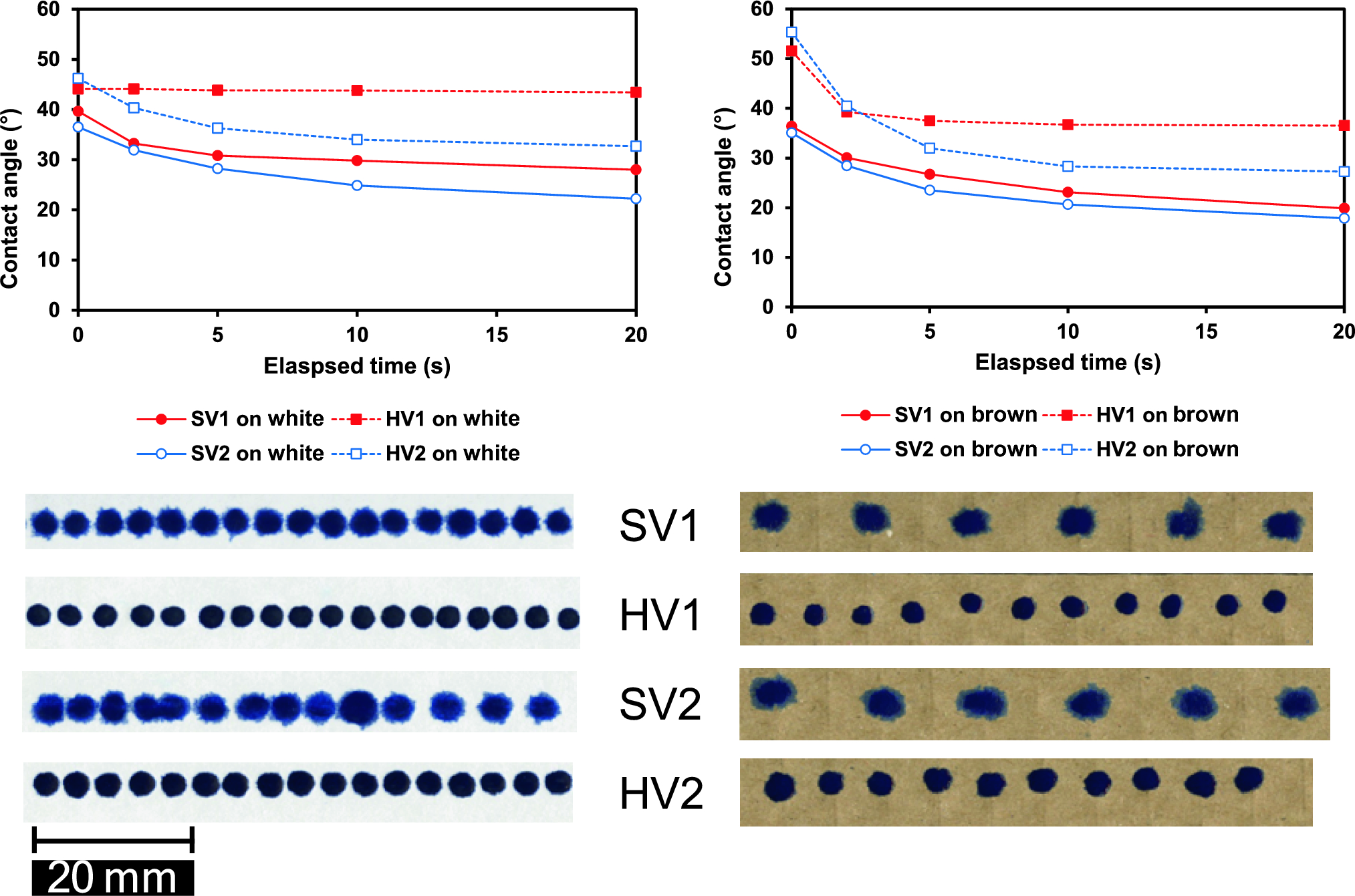 The higher-viscosity inks contained more pigment than their lower-viscosity counterparts, yet this can only partially account for their greater color strength on white liner. For context, SV1 and HV1 had pigment loadings of 3.5% and 4.3%, respectively, which represents an increase of around 23%, yet the increases in print density, and tendency not to plateau, were well in excess of what might be expected by a simple ratio of the pigment loading and gsm. Also, SV2 and HV1 had very similar pigment loadings, yet substantially different color, while HV2 had ~ 50% more pigment than HV1 yet had a lower maximum cyan density. Given that the pigment type is the same across the various inks, the maximum densities achieved on white liner appear be primarily due to the viscosity itself, while the higher pigment loadings in SV2 and HV2 gave them higher color densities at the low coverage/gsm end compared with their respective set 1 inks. The densities achieved by the higher-viscosity inks represent a very substantial increase in color density over conventional viscosity inks. When wetting characteristics of the inks were compared (Fig. 4), the higher-viscosity inks were found to spread to less of an extent than the standard-viscosity inks.