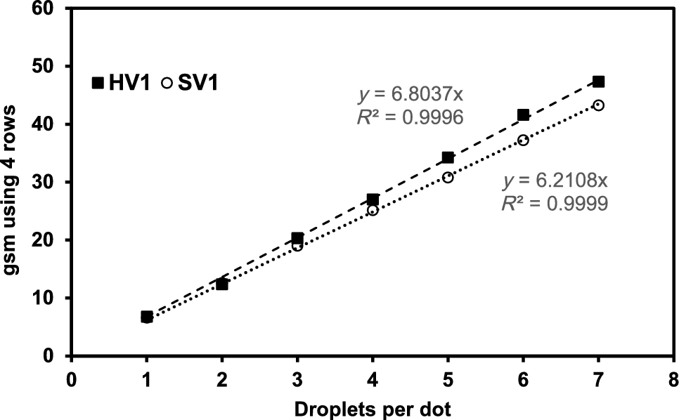 Sample ink mass test data are shown in Fig. 5 as plots of grams of wet ink deposited per square meter of substrate (gsm) vs. droplets per dot (analogous to grey level). Data are presented for SV1 and HV1 inks printing with all 4 rows and at different grey levels using the settings described in Table 5. There was a straight-line relationship between grey level (droplets-per-dot) and mass of ink deposited, as there was between number of printheads used and mass of ink. Maximum coverage and estimated droplet size are summarized in Table 5. HV1 gave a slightly larger drop size than SV1, while SV2 and HV2 gave very similar drop sizes to one another but larger than both SV1 and HV1. The mass data were used to standardize the colorimetric data to allow prints to be compared by ink mass deposited.