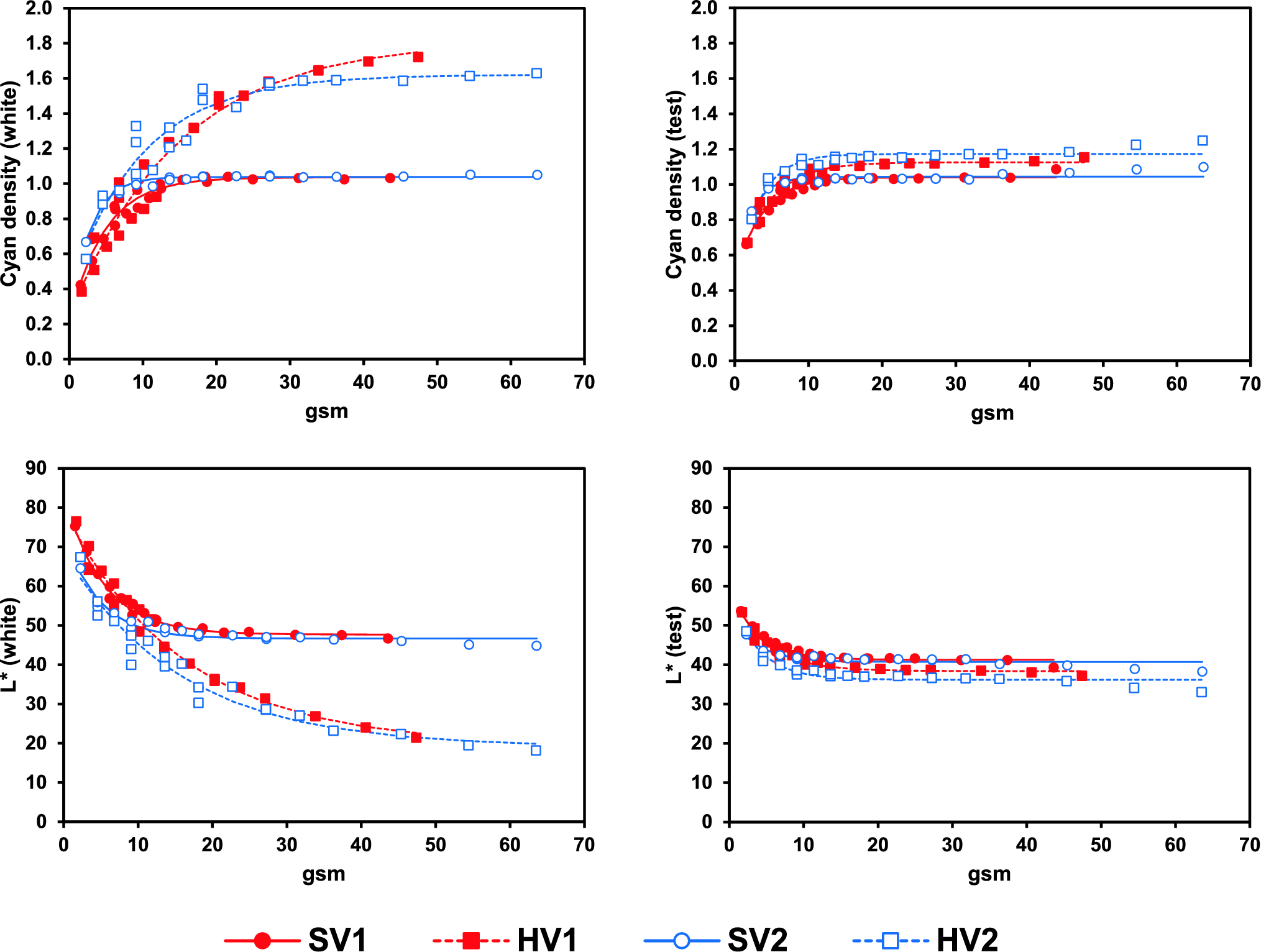 Generally, the higher-viscosity inks showed higher density values and lower CIE L* values than the standard-viscosity inks for a given ink volume (gsm). For the white liner, HV1 showed a substantially higher color density than SV1, with a maximum cyan density of 1.72 compared with 1.03 for SV1, representing an up to 60% increase in density. There was also a continual increase in cyan density with HV1 coverages beyond 40 gsm, whereas the density of SV1 plateaued at around 20 gsm, with further increases in ink deposit having no significant effect on the color density. The greater cyan density of HV1 was accompanied with a much lower CIE L* value, again without a plateau at high loading. Similar trends were evident for ink set 2 with HV2 showing a substantially higher color density than SV2 (up to 53% increase in density at high coverage) and also a much lower CIE L*.
