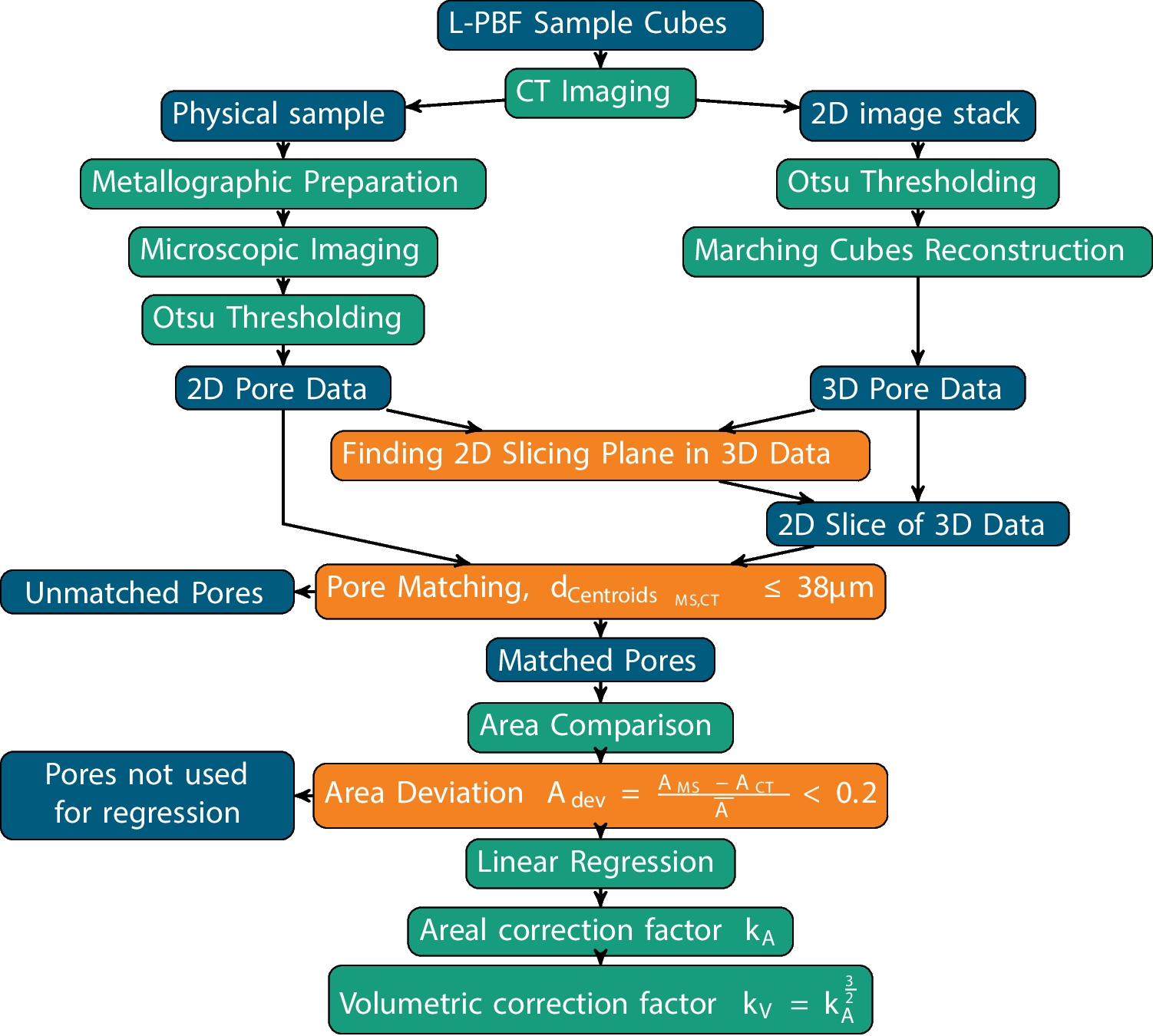 Pore data processing workflow for metallography and CT, estimation of correction factor after pore matching
