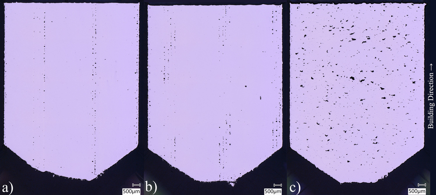 High-resolution images were captured using a VHX 5000 (Keyence, Osaka, Japan) optical microscope. Figure 2 shows the images of the cut sections of the samples with different processing parameters. The different level of porosity can be clearly seen, also notable are the different pore sizes comparing the “GP" parameters and the “LoF" parameters (see Fig. 2b and c). The microscopic image was thresholded using Otsu’s method [17] to differentiate the pores from the surrounding material. Subsequently, the pores were labeled using the Python library scikit-image [19], allowing for individual pore identification. Some shape distortion might arise during sectioning and polishing. The measured pore size from metallography might not perfectly represent the original pore.