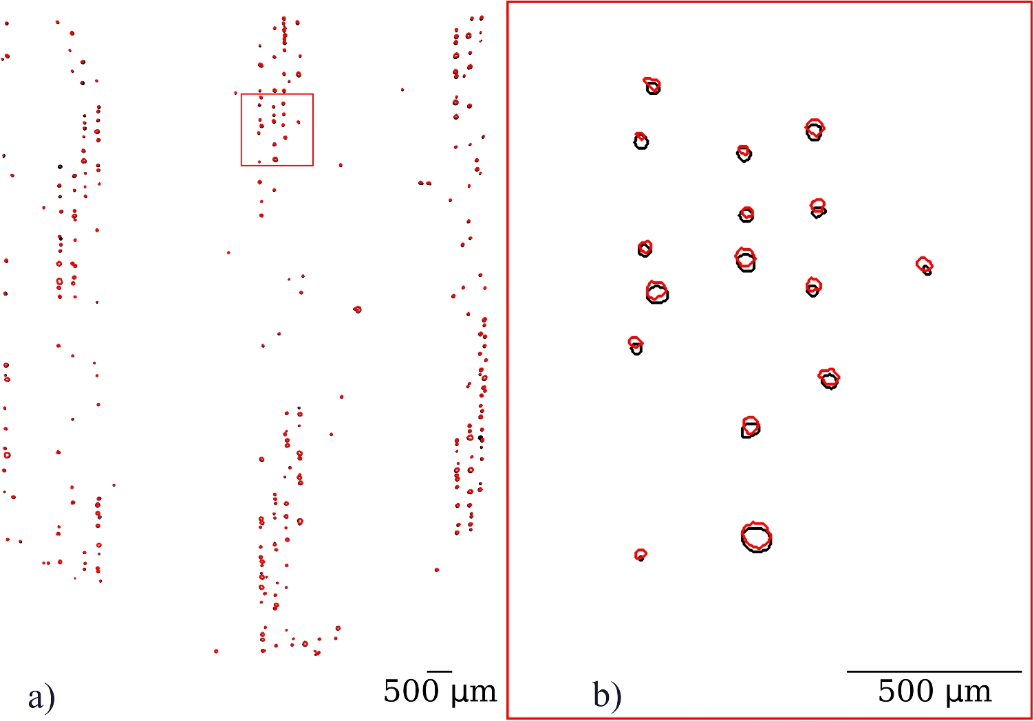Surface matching results for parameter set “GP". Black represents metallographic data, while red represents CT data. Pores smaller than the CT resolution limit (10 \(\upmu \)m) were only detectable through metallographic imaging. b) shows an enlarged section of the matched data, similarities between both data sources are visible