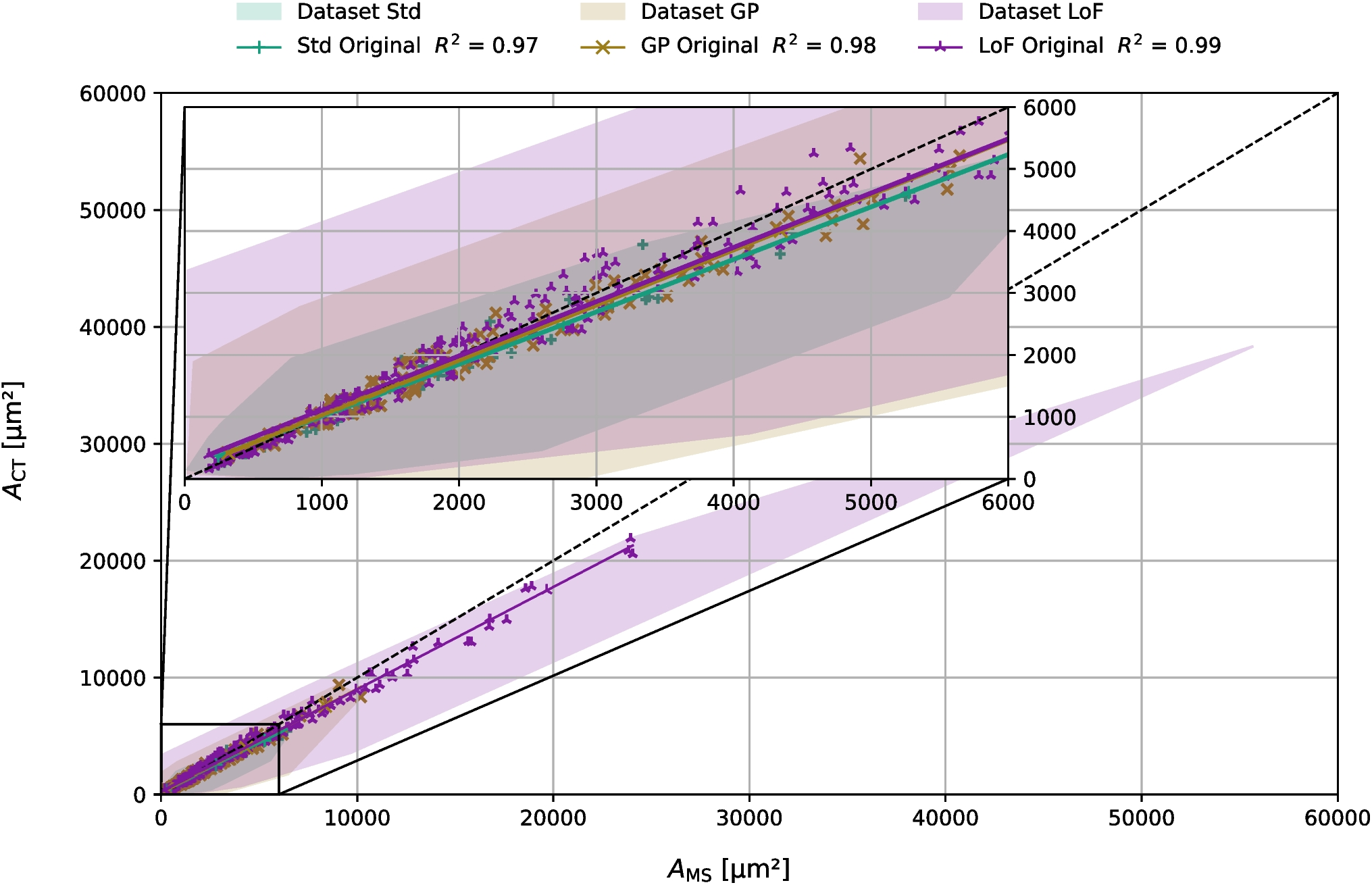 Plot of the area difference between the metallographic and computed tomography data source for all parameter sets. The dashed line indicates same areas measured by the CT and MS at the cut section. The enlarged section shows smaller pores (cut section up to 6000 \(\upmu \)m\(^2\)) present in the parameter set “Std" and “GP", the coloured areas depict all matched pores in the parameter sets, while the scatterpoints depict the dataset of each parameter set used for the linear regression
