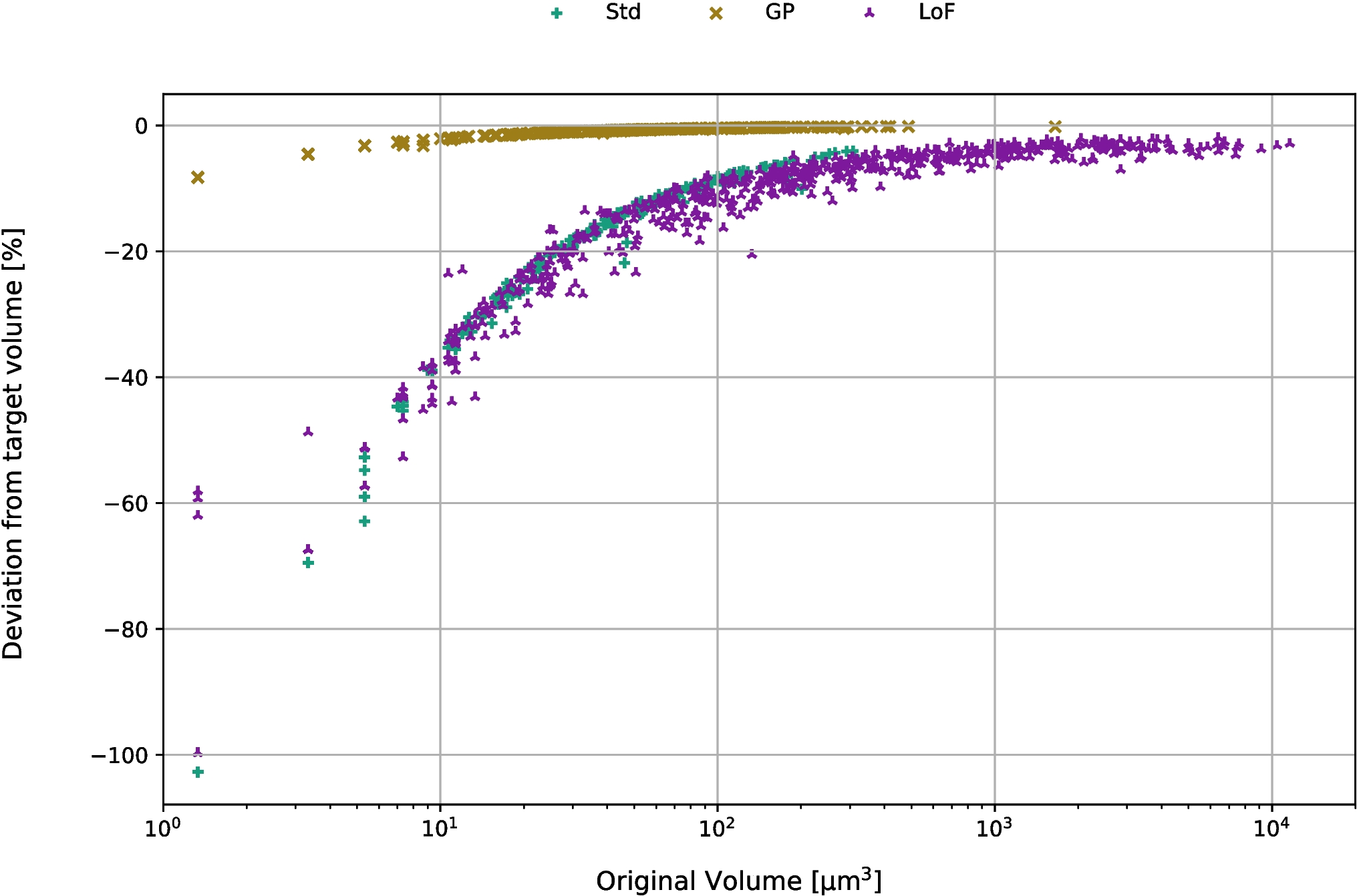 Differences in volume change based on the original pore volume with a fixed rescaling factor. Due to the subdivision, the volume change does not reach the target. This effect is more pronounced for smaller pores with lower volumes (\(V \le 100\)\(\upmu \)m\(^3\)). The scatter in volume changes for similar original volumes in the “LoF" parameter set could be explained by different sphericities of the pores and a more complex shape compared to gas pores, which influences the subdivision algorithm and the subsequent volume change