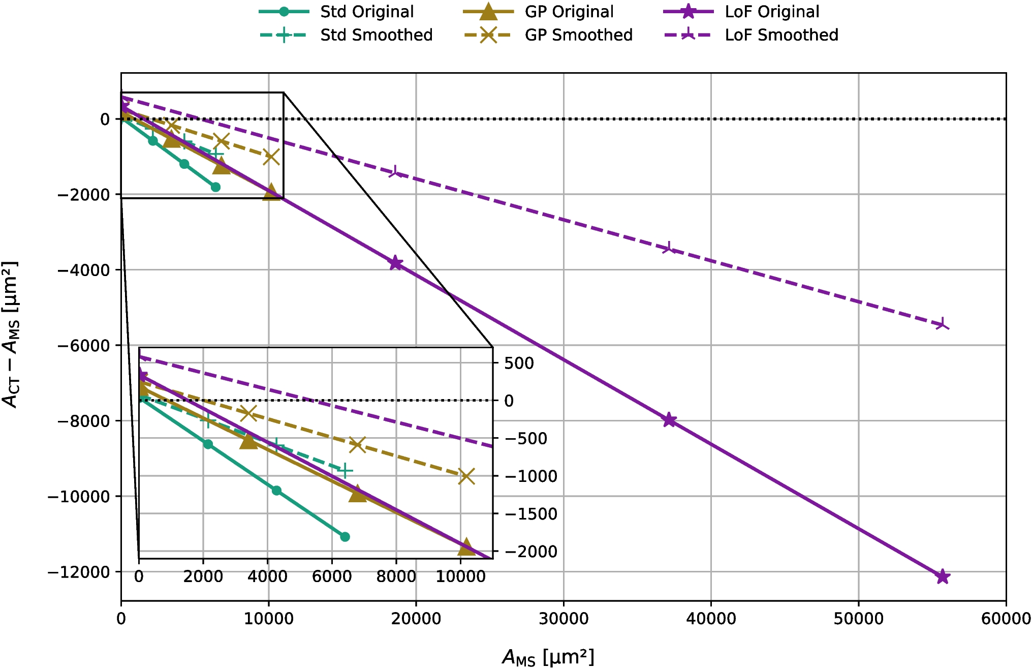 The difference between linear regressions of cut section areas from microsectioning (MS) and rescaled, smoothed CT data. The workflow reduced the difference between pore areas at the cut section for all three parameter sets compared to the original CT data. The enlarged section shows a detailed view for the data sets “Std" and “GP", which have smaller cut section areas than data set “LoF"