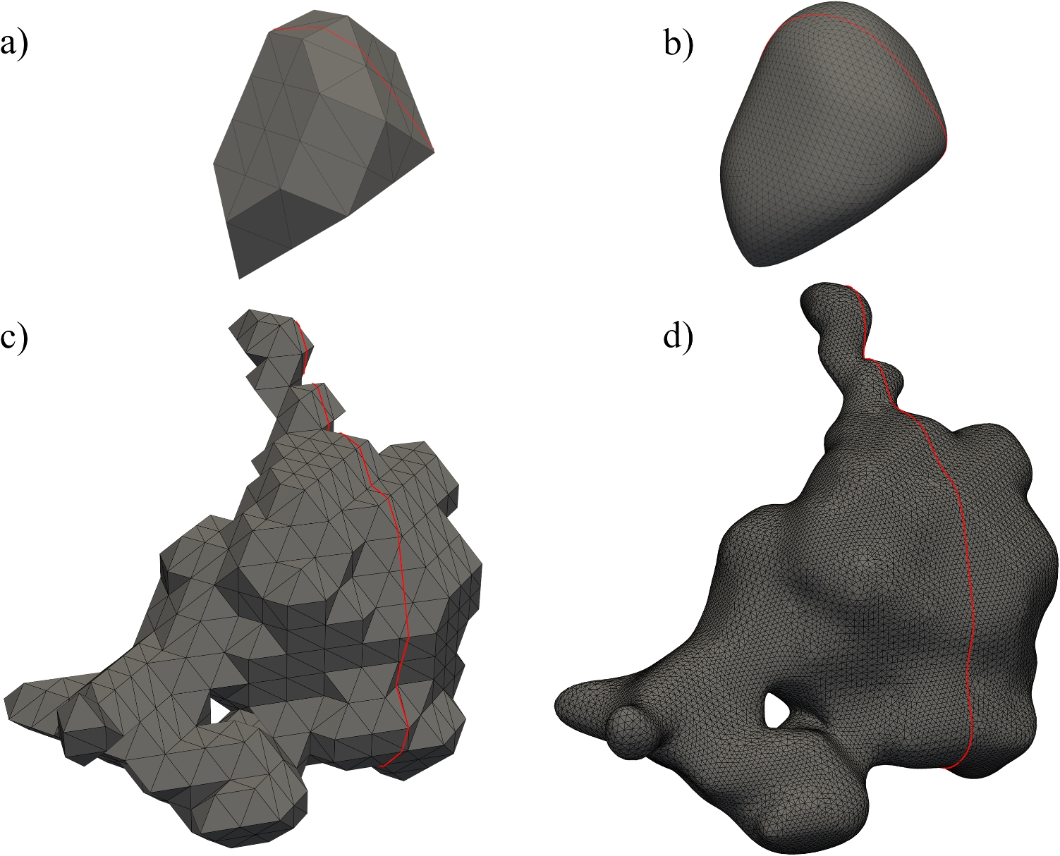 The effect of mesh smoothing on the pore is investigated by considering the curvature. To compare the result of the pore smoothing workflow to the initial mesh one needs to account for the mesh vertices increase by the subdivision algorithm. This is done by sorting each mesh point by curvature and a subsequent normalization of the x-axis to compare multiple pore meshes. Figure 7 shows that for all three parameter sets, the mean curvature of the smoothed meshes are lower than the mean curvature of the original meshes. To illustrate this change, Fig. 8 shows selected pores from the parameter sets “GP" and “LoF". The smoothing removes most of the stepwise features from the Marching-Cubes reconstruction, while keeping the overall shape of the pore. The red line indicates the cut-section line used for the area comparison with the metallographic image. Pores Figs. 8a and c are unsmoothed pores from the CT data, Figs. 8b and d are the pores after the rescaling and smoothing workflow. Pore Fig. 8a is extracted from the parameter set “GP" and represents a smaller pore, with a volume of \(V_\textrm{a} = 4.75 \times 10^{-5}\, \textrm{mm}^3\) which increased \(29\%\) to \(V_\textrm{b} = 6.07 \times 10^{-5} \, \textrm{mm}^3\) due to rescaling and smoothing. The cut section area increased by \(19\%\). Pore Fig. 8c represents a larger pore, extracted from the parameter set “LoF", with a pore volume \(V_\textrm{c} = 6.51 \times 10^{-4}\, \textrm{mm}^3\), increased by \(24\%\) to \(V_\textrm{d} = 8.08 \times 10^{-4}\, \textrm{mm}^3\). The cut section area also increased by \(19\%\).