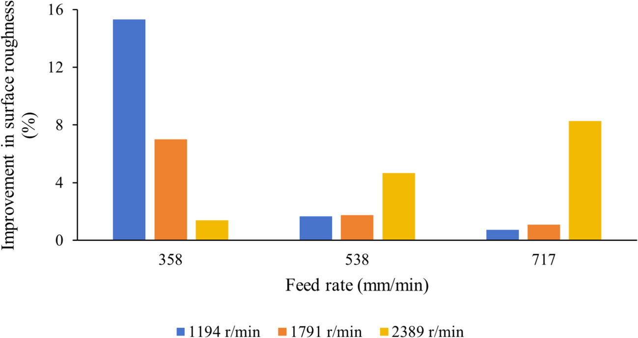 Lower feed rates, such as 358 and 538 mm/min, produce relatively constant cutting forces along the entire length. In contrast, with a higher feed rate of 717 mm/min, the resultant cutting force rose as both the machined length and spindle speed increased. Generally, higher feed rates lead to higher cutting forces [50, 51]. At elevated feed rates, tools are more prone to vibrations, which can further elevate cutting forces. Additionally, increased feed rates can lead to machine instability and tool vibrations, which are affected by cutting speed, cutting depth, and cutting forces [52]. Machine tool vibrations are classified into three types: free, forced, and self-induced [52, 53]. Tool wear is another element that facilitates the steady rise in cutting force as the cutting length increases [54, 55]. Pratap et al. [56] indicate that accelerated tool wear rates are the primary cause of increased cutting forces.