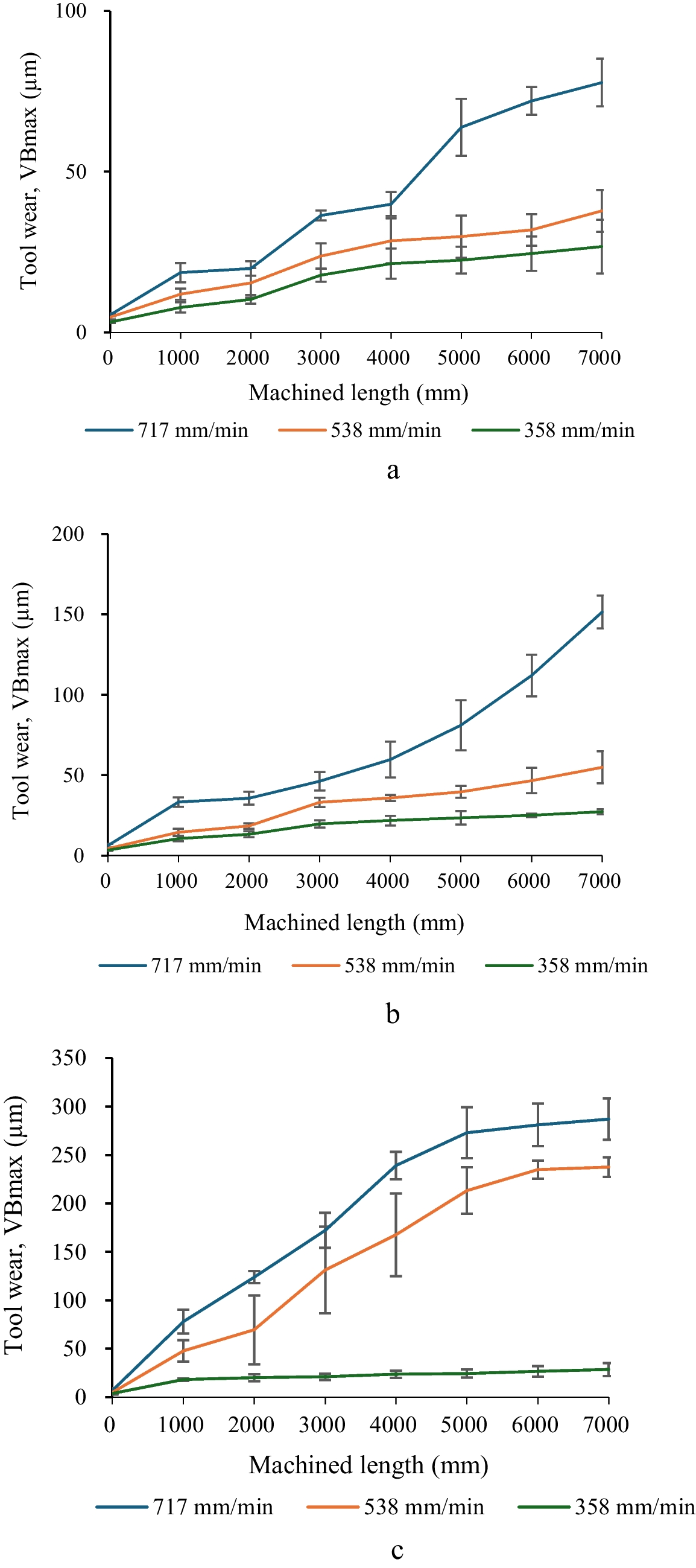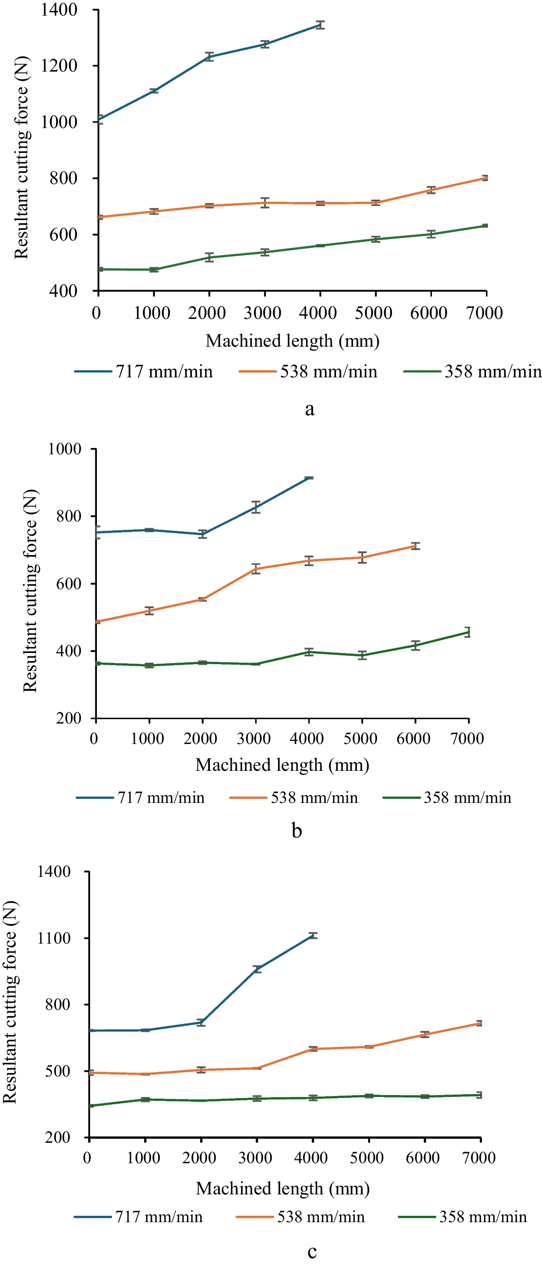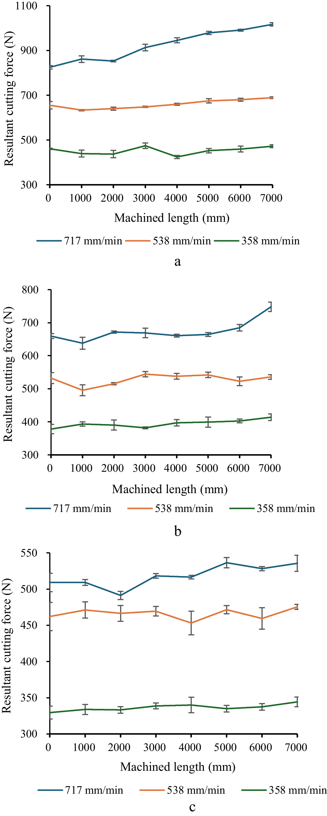 Variation in resultant cutting force in relation to the machined length at 358, 538, and 717 mm/min feed rates under MQL cooling strategy with spindle speeds of a 1194 r/min, b 1791 r/min, and c 2389 r/min