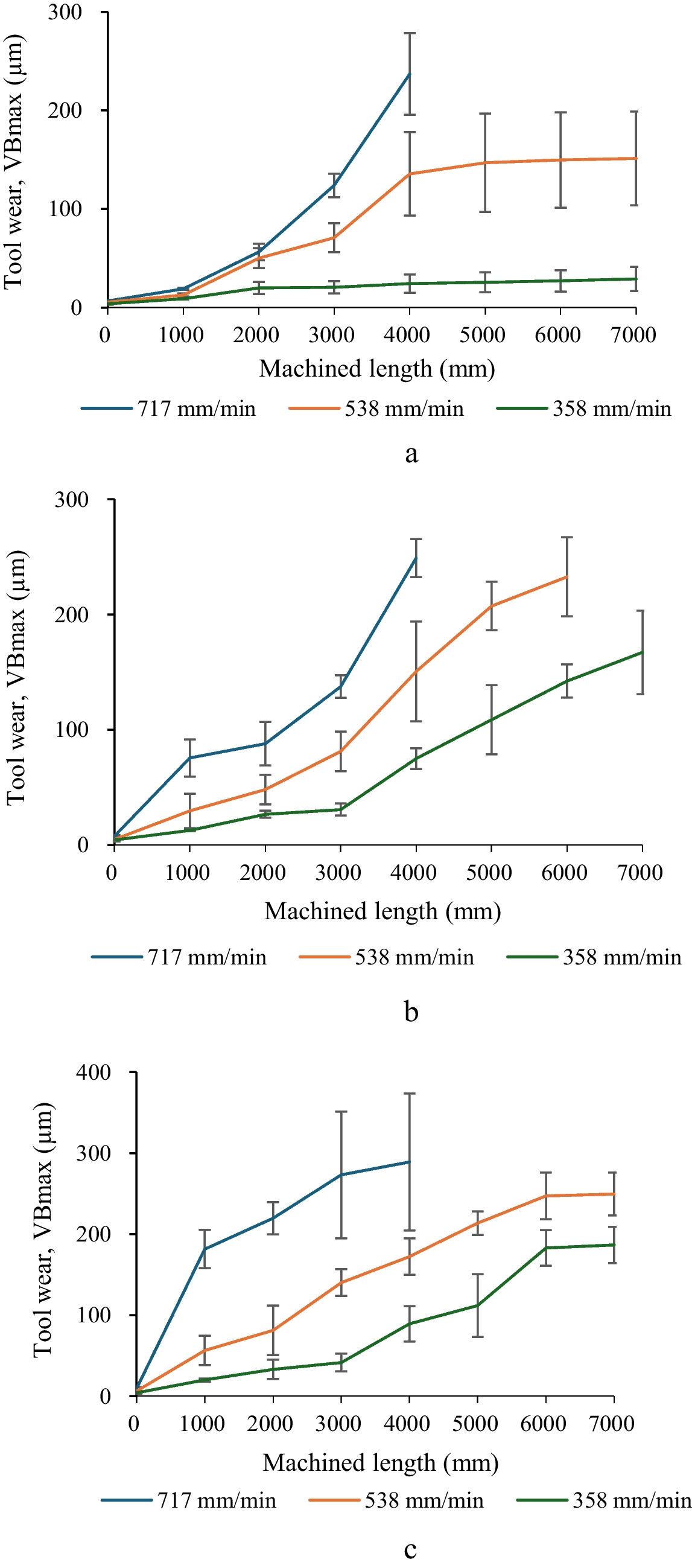 Figure 4 depicts how the cutting forces vary with machined length, considering various spindle speeds and feed rates during high-speed Ti6Al4V machining using an MQL cooling strategy. In Fig. 4a, at a spindle speed of 1194 r/min, the resultant cutting force exhibited a slight decrease from 0 to 2000 mm of machined length for feed rates of 358 mm/min and from 0 to 1000 mm of machined length for feed rates of 538 mm/min. Subsequently, for the 538 mm/min feed rate after the 1000 mm machined length, the resultant cutting force increased gradually (remaining relatively constant) as the machined length increased. In contrast, for the 717 mm/min feed rate, the cutting force rose from 824 to 1017 N. At a spindle speed of 1791 r/min, as seen in Fig. 4b, the average resultant cutting forces along the machined length were 395 N for the 358 mm/min feed rate and 528 N for the 538 mm/min feed rate. Notably, the cutting force for the 717 mm/min feed rate remained stable, ranging from 637 to 685 N until reaching a machined length of 6000 mm, at which point it experienced a sudden increase to 748 N at 7000 mm. In Fig. 4c, the resultant cutting forces for the 358 mm/min feed rate remained constant over the machined length, whereas the forces for the 538 mm/min and 717 mm/min feed rates fluctuated along the machined length, with average cutting forces of 466 N and 518 N, respectively.