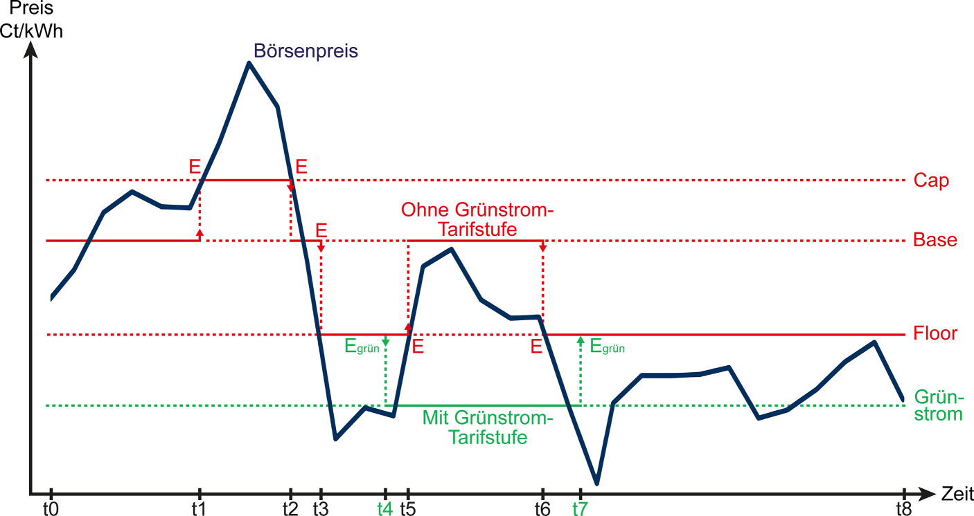 Beispielhafte Darstellung des Tarifkonzepts (Drei-Stufen-Tarif) inkl. der Tarifstufe „Grünstrom“. Das Tarifereignis E löst einen Tarifstufenwechsel in die Tarifstufe Cap/Floor aus, wenn der entsprechende Schwellwert des Börsenpreises über- oder unterschritten wird. Wenn die Bedingung für die Grünstrom-Tarifstufe erfüllt ist, wird durch das Ereignis Egrün ein Tarifstufenwechsel in die Grünstrom-Tarifstufe ausgelöst. Der vereinbarte Grünstrompreis überlagert dann den Preis aus dem Drei-Stufen-Tarif