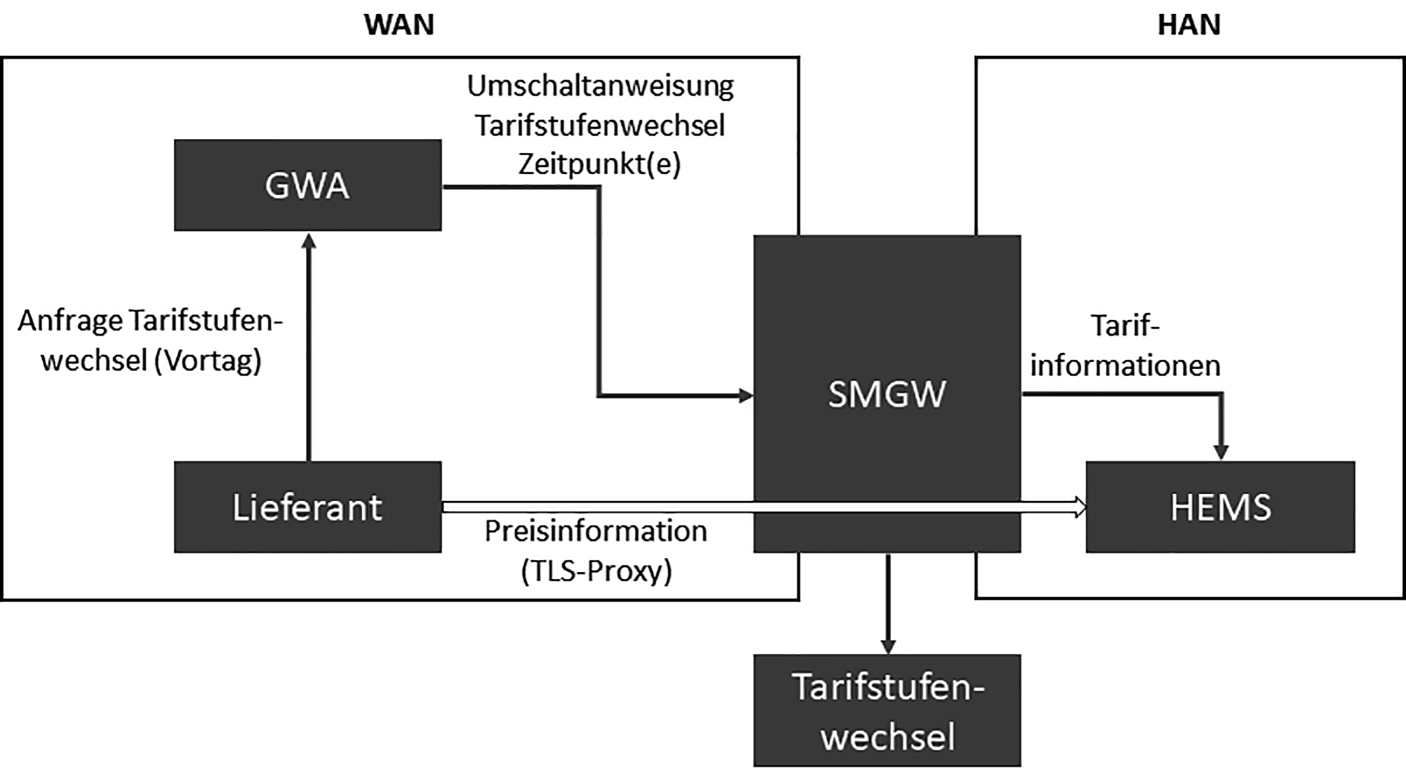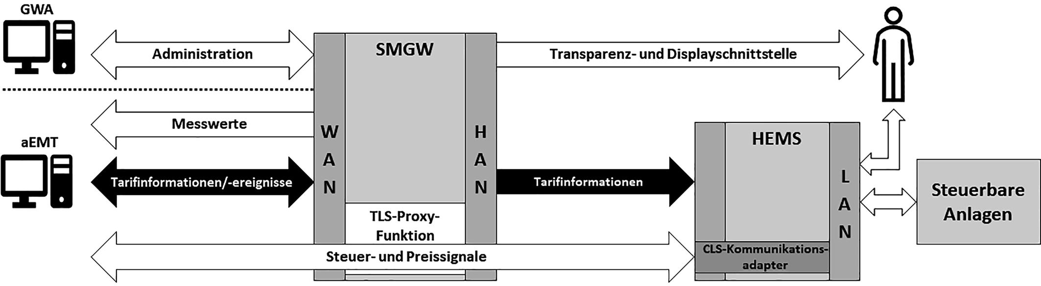 Zur Umsetzung des in Kapitel 4 beschriebenen Tarifs ist eine komplexe Signalisierung zwischen den beteiligten Akteuren notwendig. Grundsätzlich stehen innerhalb des SMGW zwei Netzwerkschnittstellen für die kommunikative Anbindung zur Verfügung. Zum einen das Wide-Area-Network (WAN) für die Anbindung von aktiven externen Marktteilnehmern (aEMT) sowie den Gateway-Administrator (GWA) und zum anderen das Home-Area-Network (HAN) für die Anbindung von steuerbaren Anlagen. Wie einleitend bereits beschrieben, wurde durch die TR 01309‑5 die Anforderungen für eben diese kommunikative Anbindung definiert. Für die in diesem Beitrag beschriebenen Tarifkonzepte erfolgt die Steuerung der Anlagen über das HEMS, welches über die TLS-Proxy-Funktion an das SMGW angebunden ist. Die Abb. 3 illustriert die logischen Kommunikationsschnittstellen zwischen SMGW und HEMS sowie die Art der Datenübertragung.