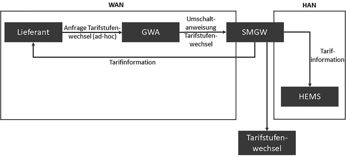 Wie aus der Beschreibung der Tarifkonzepte (vgl. Kapitel 4) hervorgeht, werden die Ereignisse für einen Tarifstufenwechsel im WAN durch den Lieferanten ausgelöst. Für die Signalisierung der Tarifstufe „Grünstrom“ sendet der Lieferant (in der Rolle des aEMT) eine Anfrage für den Tarifstufenwechsel an den GWA als autorisierten Akteur. Der GWA wiederum sendet die Tarifumschaltanweisung an das SMGW, wie in Abb. 4 dargestellt. Diese Art der Signalisierung ist nach der aktuellen Spezifikation des Stufenmodells Version 1–2 des BSI (2021a) bereits möglich, da eine bidirektionale Kommunikation zwischen GWA und SMGW erlaubt ist.