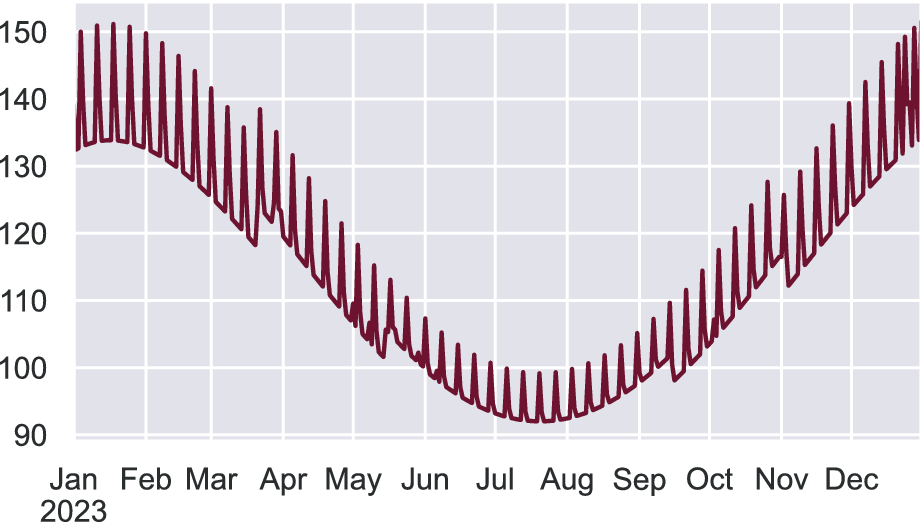 Standardlastprofile kommen in der Energiewirtschaft zur Anwendung um die Lastverläufe von Kunden abschätzen zu können, die im Gegensatz zu Großkunden nicht täglich ausgelesen werden. Sie bilden damit eine wichtige Grundlage für die Energiebeschaffung und die Kalkulation von Strompreisen. Haushaltskunden werden unter dem Haushaltsprofil H0 (BDEW Bundesverband der Energie- und Wasserwirtschaft 1999) aggregiert betrachtet. Abb. 6 zeigt die Differenzierung des Profils hinsichtlich Saison und Wochentag. Zur Berechnung des Verbrauchsverlaufs über das Jahr wird das Profil in Abhängigkeit des Tages im Jahr dynamisiert, um starke saisonale Sprünge zu vermeiden und den gesteigerten Verbrauch im Winter sowie verminderten Verbrauch im Sommer abzubilden (siehe Abb. 7). Das H0 Profil bildet die Grundlage zur Kalkulation unseres Ein-Tarif-Referenzpreises sowie zur monetären Bewertung des vorgestellten Drei-Stufen-Tarifmodells.