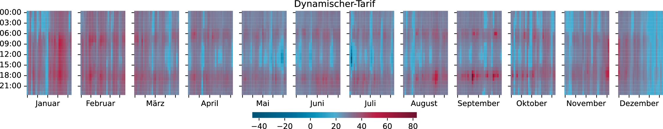 In Abb. 8 wird das Tarifschema anschaulich präsentiert. Die Darstellung auf der Ordinate umfasst die Uhrzeiten, während die Abszisse die Monate des Jahres abbildet. Die verwendete Farbskala (Colormap) repräsentiert den Endpreis für den Kunden, ausgedrückt in Cent je Kilowattstunde. Diese Farbcodierung und Achsenbeschriftung gelten ebenso für alle nachfolgenden Diagramme ähnlicher Art in dieser Veröffentlichung. Der Day-Ahead-Preis wird neben der Photovoltaik-Erzeugung von verschiedenen Faktoren beeinflusst. Laut dem Fraunhofer ISE-Bericht „Aktuelle Fakten zur Photovoltaik in Deutschland“ sind die Preise, insbesondere in den Monaten März bis Oktober zur Mittagszeit, tendenziell niedriger, was sich durch die dominierende Photovoltaikerzeugung während dieser Stunden erklären lässt (Wirth 2024). Am Vormittag und in den Abendstunden hingegen steigen die Preise an, was auf Lastspitzen zurückzuführen ist. In den Wintermonaten (November bis Februar) weicht dieses Muster ab. Darüber hinaus können sowohl hohe als auch niedrige Preise zu unterschiedlichen Tageszeiten auftreten, was auf die verstärkte Windenergieerzeugung in diesen Monaten zurückzuführen ist (Agora Energiewende 2024). Es ist zudem anzunehmen, dass der steigende Anteil der erneuerbaren Energien im deutschen Strommix diese Preisstruktur weiter akzentuieren wird. In 2023 war der günstigste Day-Ahead Market-Clearing-Preis bei −500 €/MWh (negativer Preis) und der teuerste Preis bei 524 €/MWh. Addiert man dazu Netznutzungsgebühren, Abgaben, Steuern und Marge, ergibt sich eine Spanne für den Endkundenpreis von −45,11 ct/kWh bis +82,88 ct/kWh.