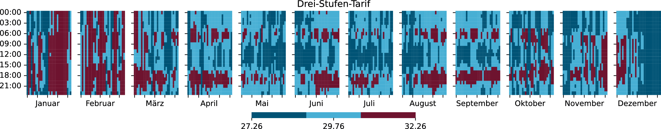 Der im Folgenden beschriebene „Drei-Stufen-Tarif-optimiert“ ist eine Variante des Drei-Stufen-Tarifs und basiert auch auf den stündlich aufgelösten Day-Ahead-Preisen des Jahres 2023. Er zielt ebenfalls darauf ab, die Komplexität im Vergleich zu dynamischen Tarifen zu reduzieren. Dieser Tarif zeichnet sich durch seine methodische Herangehensweise aus, bei der die Tarifstufen auf der Grundlage von Optimierungsalgorithmen und nicht, wie im Drei-Stufen-Fix-Step-Tarif, durch festgelegte Quartile bestimmt werden. Diese Vorgehensweise ermöglicht eine adaptivere und präzisere Tarifstrukturierung, die sich eng an den sich wandelnden Marktdynamiken orientiert. Dieser Ansatz ermöglicht eine effizientere und effektivere Preisgestaltung, die sowohl für Energieversorger als auch für Verbraucher von Vorteil sein kann.
