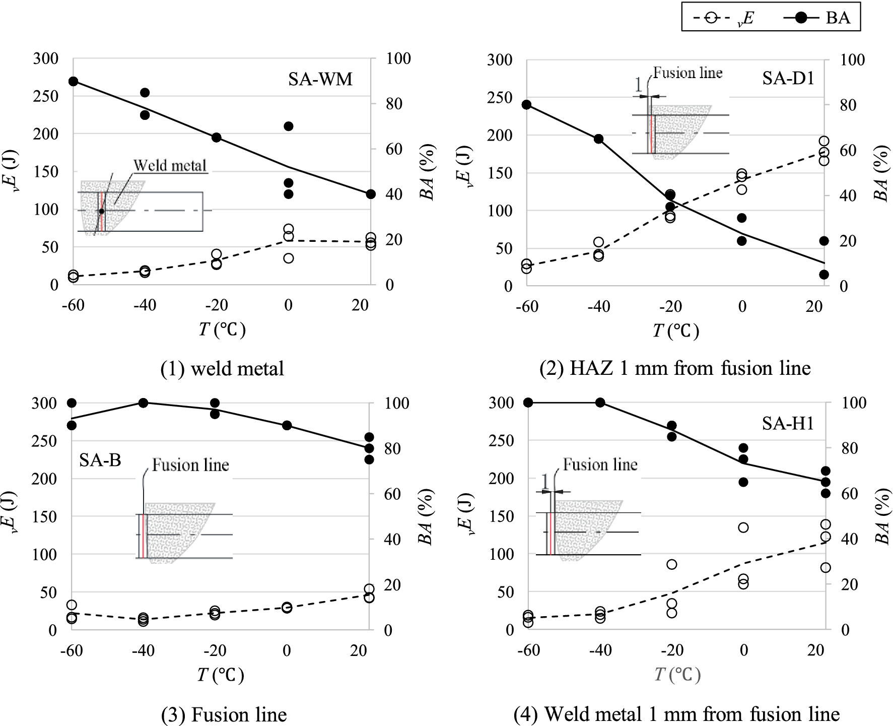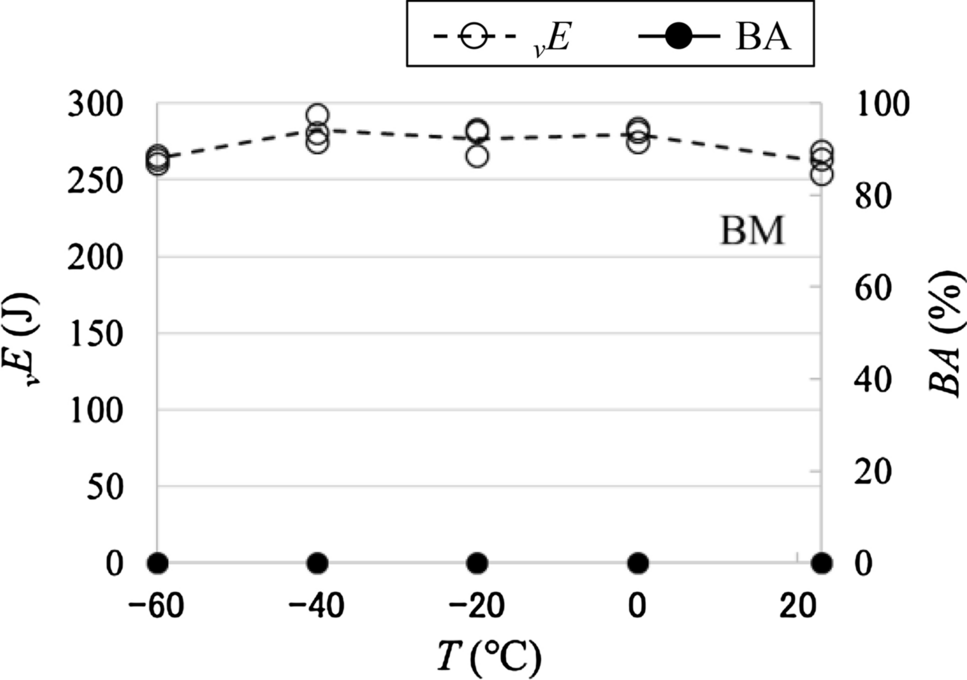 The Charpy impact test results from the BM samples are shown in Fig. 10, and the test results from the SA-WM, SA-D1, SA-B and SA-H1 samples are shown in Fig. 11. The Charpy absorbed energy vE is shown in the left column, the percent cleavage fracture (in ISO 148-1; and the term is also referred to as the percent brittle fracture in JIS G0202) BA is shown in the right column, and the test temperature is shown on the horizontal axis. In each graph, the filled circles denote vE, the open circles denote BA, and the dashed line and solid line denote the average of vE and BA.