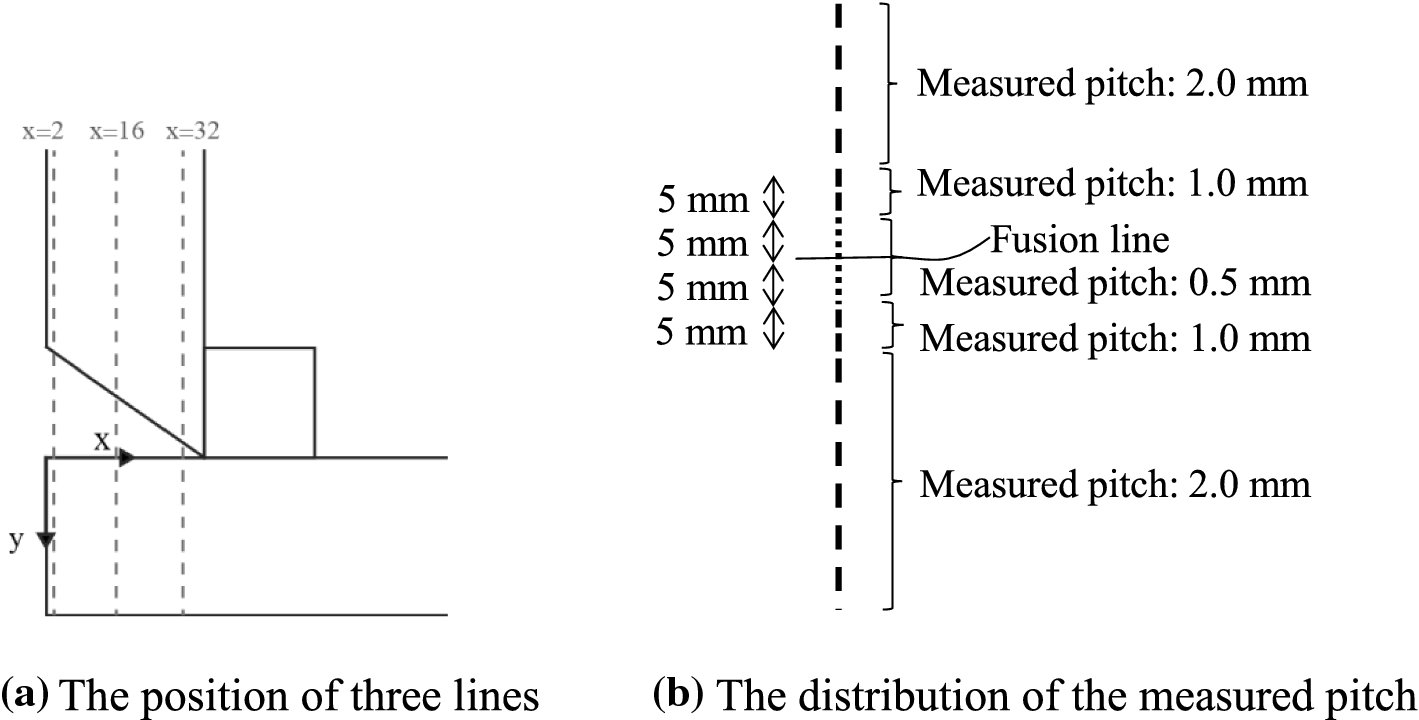 Measurement positions. a The position of three lines, b The distribution of the measured pitch
