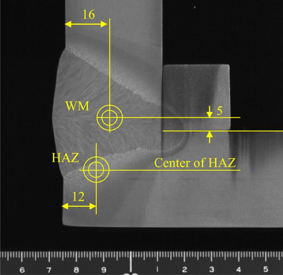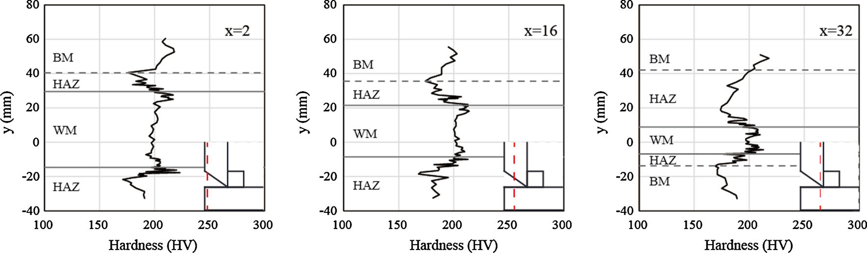 To investigate the mechanical properties around the submerged arc weld, a Vickers hardness test was conducted with a test load of 5 kgf (49.03 N). As shown in Fig. 12a, the Vickers hardness was measured along three lines with x = 2, 16, and 32 mm. The pitch of the measured points was determined according to the distance from the fusion line, as shown in Fig. 12b.
