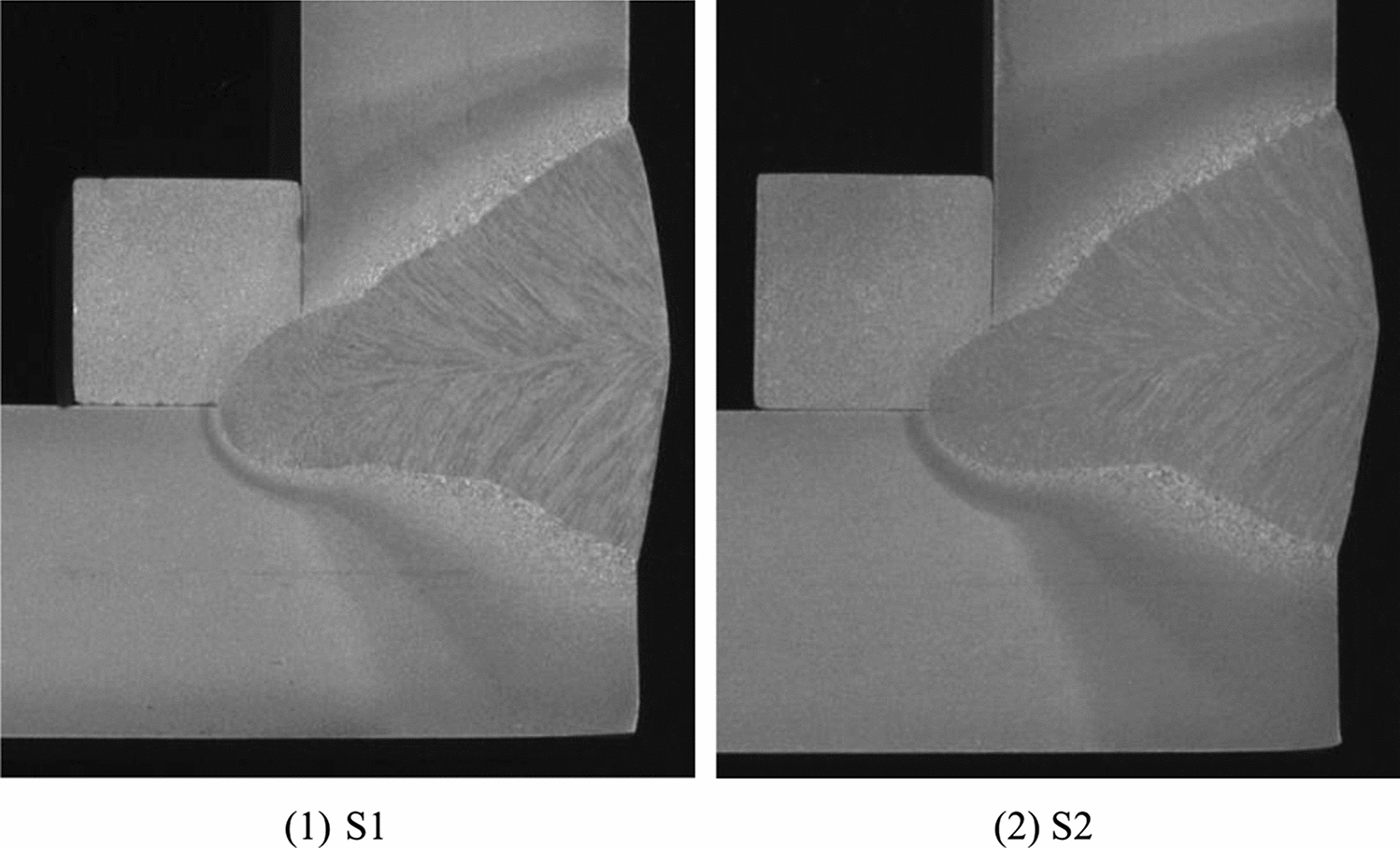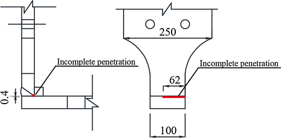 To investigate the toughness of SA440C corner weld fabricated by SAW, a bending test was conducted. Two L-shaped specimens (S1, S2) cut from the corner of a built-up box column with dimensions of 800 × 800 × 36 (SA 440 C) were used, as shown in Fig. 14. The macroscopic cross-section photos in the vicinity of the position where both specimens were cut from are shown in Fig. 15. Due to ultrasonic testing (UT) performed prior to the bending test, a welding defect of incomplete penetration was found in Specimen 2 (S2). The length of the defect is larger than the allowable value in the Japanese standard for weld defects (AIJ 2008). The location of the defect is shown in Fig. 16.