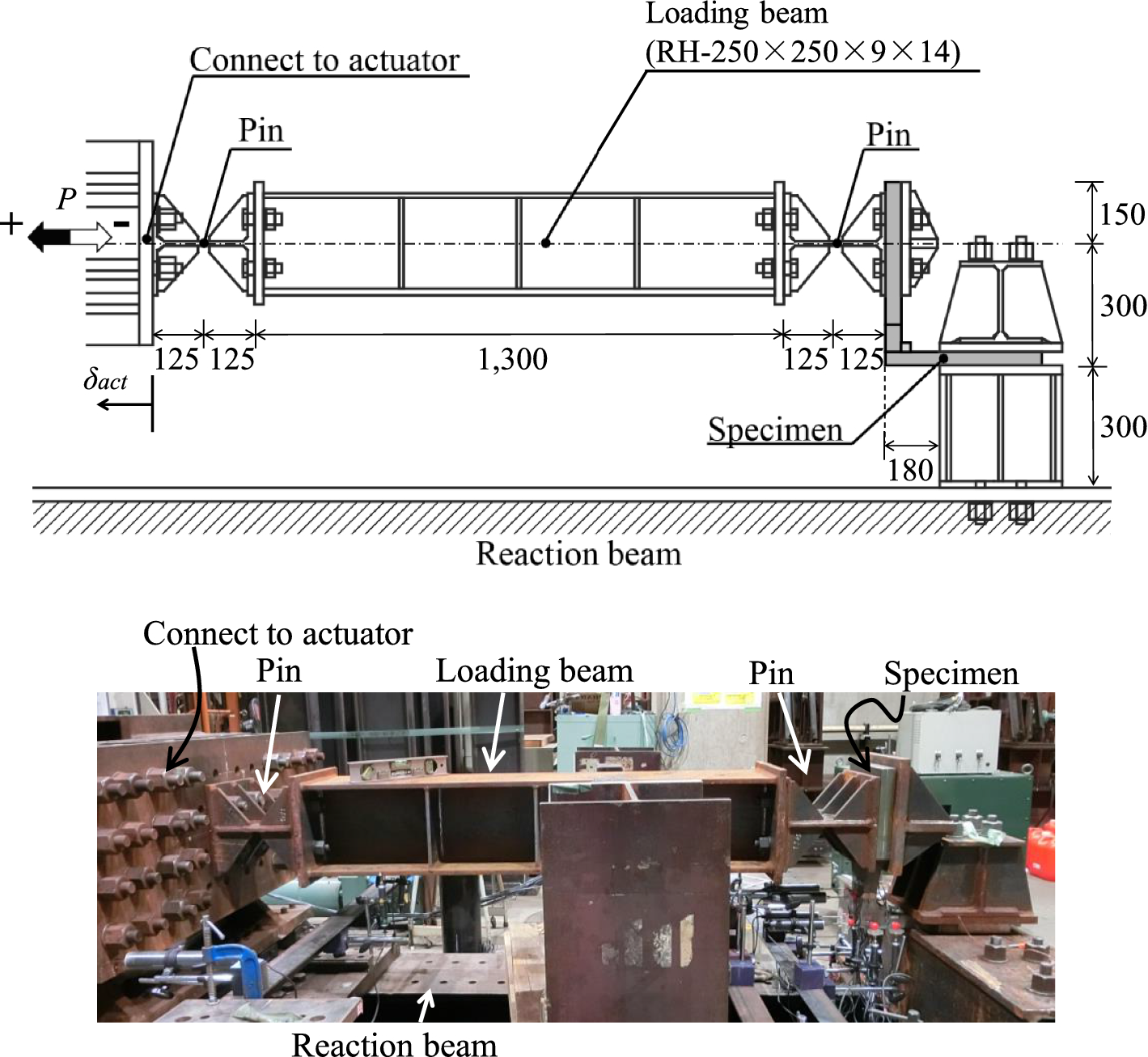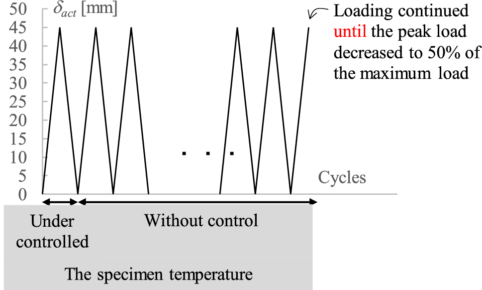 The test apparatus is shown in Fig. 17. The bottom of the specimen is fixed to the reaction beam. The top of the specimen is connected to the actuator via the loading beam, and it is loaded in the horizontal direction. The actuator, the loading beam, and the specimen are connected with a 14 mm thick plate at the location shown as “pin” in the flange. Although the “pin” is not a mechanical pin joint, the rotational stiffness is small enough to be considered a hinge. Simulating the out-of-plane deformation of the column flange under earthquake, cyclic loading was applied with an amplitude of 0–45 mm to the displacement of the tip of the actuator, δact, as shown in Fig. 18.