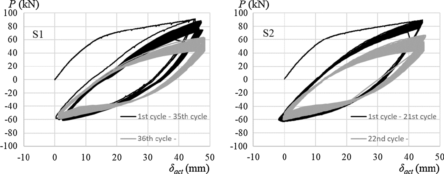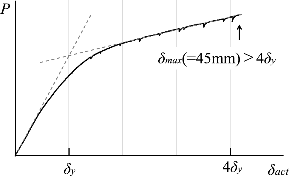 The load-deformation relations for both specimens are shown in Fig. 19. The first half-cycle of specimen S1 is shown in Fig. 20. The vertical axis represents the load P applied by the actuator, and the horizontal axis represents the displacement δact of tip of the actuator. From Fig. 20, it is confirmed that the loading amplitude of δact = 45 mm is 4 times larger than the yield deformation of the specimen.