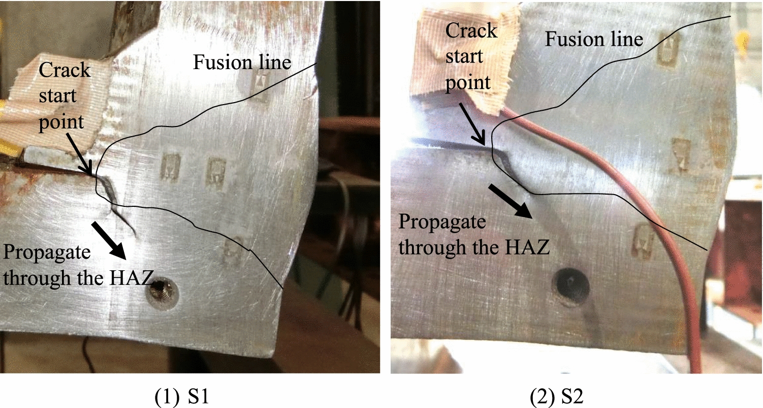The cracks on both specimens after the last cycle loading are shown in Fig. 21. The shapes of the cracks for both specimens are almost the same. The crack initiated at the slit tip between the backing strip and the flange plate and propagated in the direction or 45 degrees through the HAZ, whose strength was decreased by heat input of welding. The notch toughness of the fusion line was very low, vE = 29 J, as shown in Fig. 10, but no crack or brittle fracture occurred along the fusion line, probably because the strength is higher than that of the HAZ, as shown in Fig. 13.