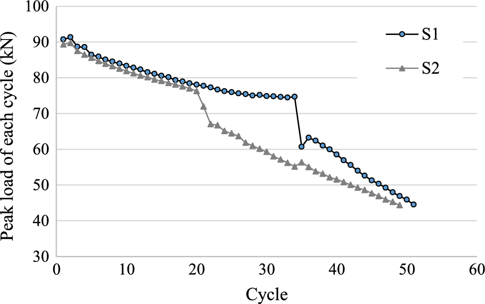 The change in the peak load of each cycle of both specimens is shown in Fig. 22. The slopes of the peak load for both specimens are similar until a sudden load drop was observed due to crack initiation. The load drop occurred earlier in the S2 specimen than in the S1 specimen, likely because of the welding defect, but the fracture was not brittle in nature. The degradation of the strength after the crack initiation was slow because approximately 50 cycles were necessary until the peak load decreased to 50% of the maximum. From this result, it can be concluded that the ductility of the submerged arc welded joint at the corner of the built-up box column was sufficiently large against the tensile force from the beam flange, even though it had welding defects that are not acceptable according to the Japanese standards of welding defect (AIJ 2008).