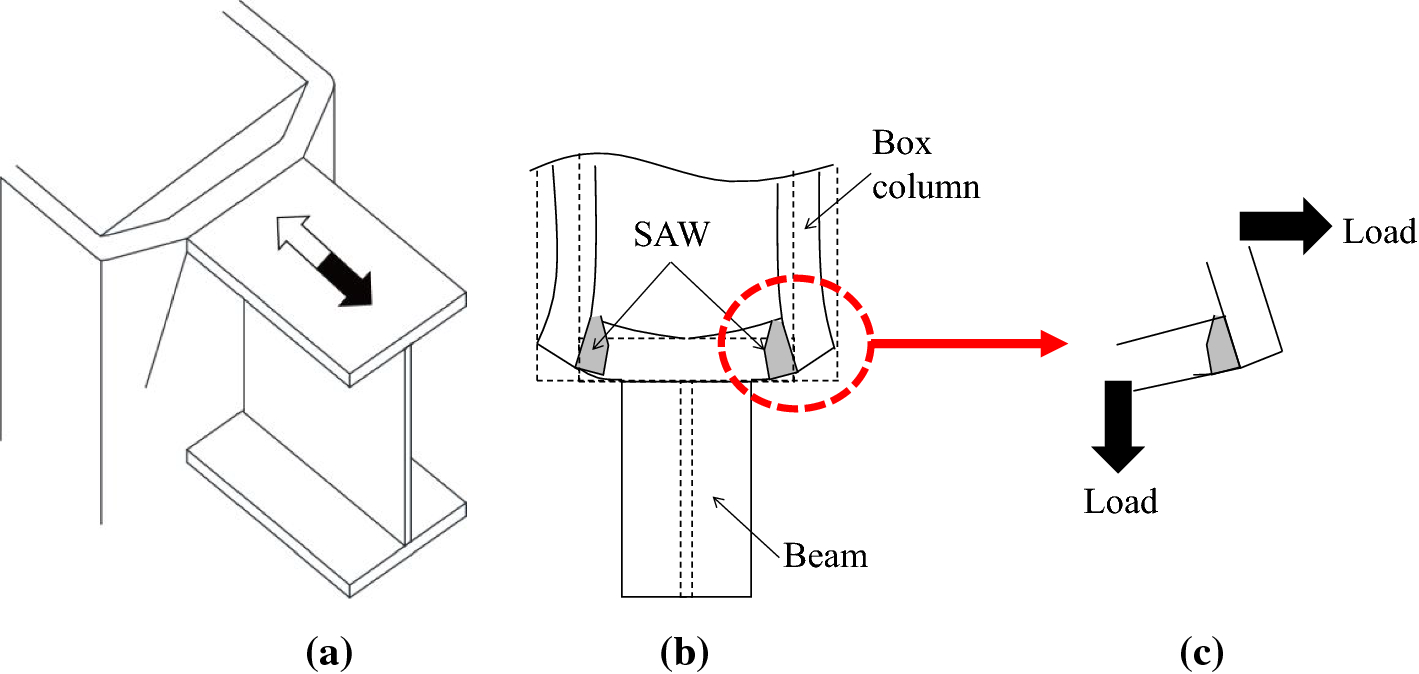 Previous studies focused on the tensile strength of the butt welding or the HAZ toughness of the corner joint by SAW. However, the stress and strain conditions around the corner joint of the box-column are completely different. Figure 2b schematically shows the deformation of the box column around the beam-to-column joint. This is the possible worst case where there is no diaphragm (or continuity plate) and the column face plate is subjected to a tensile force in the out-of-plane direction as shown in Fig. 2a. The corner of the column may be subjected to an opening and closing force, as shown in Fig. 2c. However, it has not been verified whether, or not, a corner joint in columns has enough ductility to withstand such force. In this study, to investigate the ductility of a welded corner joint comprising SA440C steel box-columns fabricated by SAW, a series of material tests and cyclic loading tests were conducted (Table 1).