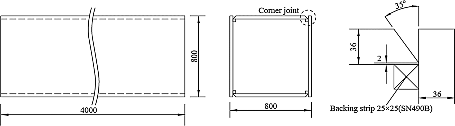 First, a built-up box column was fabricated, and test specimens were extracted from it later. The shape of the column and welding detail are shown in Fig. 3. This is the same column used in the electro-slag welding (ESW) test for SA440C steel (Iyama et al. 2019). It has a section with dimensions of 800 mm × 800 mm × 36 mm and is fabricated with SA440C steel for the flange plate and SN490B steel for the backing strip. The column flange plates were welded to each other by double-electrode SAW with a single welding pass. There is a single bevel groove with an angle of 35° and a root gap of 0 mm. The welding conditions and materials are shown in Table 2. This is the current standard welding condition for high-performance steel SA440C in Japan according to JISF (2016).
