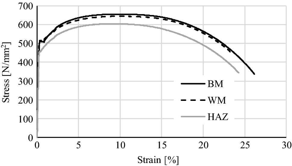 The stress–strain relationships of the BM, WM, and HAZ are shown in Fig. 6. The obtained test results are summarized in Table 5. For the HAZ specimen, because yield points did not clearly appear in the stress–strain relationships, the 0.2% offset strength was taken as yield point in the table. For the WM, both the yield point and tensile strength were equivalent to the base metal. For the HAZ, both the yield point and tensile strength were higher than the minimum specified strengths for SA440C (base metal) as shown in Table 1 (JISF 2004). However, the softening by welding heat input caused the yield point and tensile strength in the HAZ to be below the actual yield and tensile strengths of the base metal.