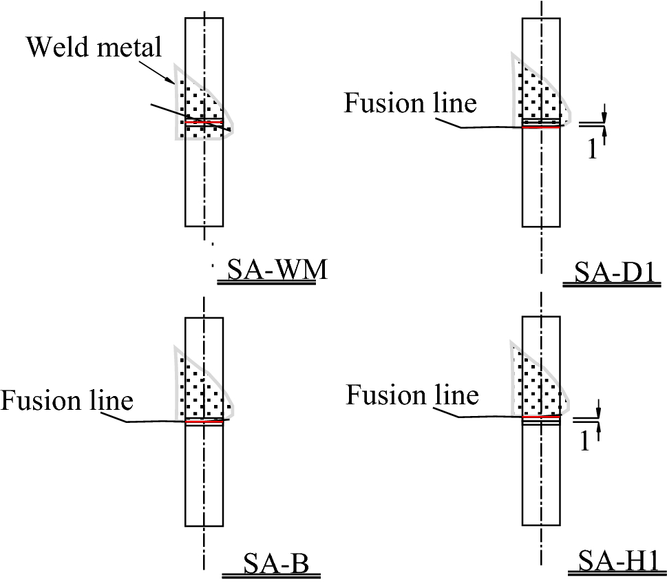 Specimens for the Charpy impact test were the V-notch type, as shown in Fig. 7. According to JIS Z2242, the size of each specimen was 10 mm × 10 mm × 55 mm. Specimens were cut from the BM and submerged arc weld regions. For the BM, the specimen was cut out from the 1/4 thickness location of the plate (Iyama et al. 2019). For the submerged arc weld region, specimens were fabricated from the bottom of the welded part, as shown by the hatched area in Fig. 8. The specimens named SA-WM, SA-D1, SA-B, and SA-H1 were prepared with different notch locations, as shown in Fig. 9. The notch of the SA-WM specimen was located center of the WM, that of SA-D1 was located 1 mm toward the WM from the fusion (bond) line, that of SA-B specimen was located on the fusion line and that of SA-H1 was located 1 mm from the fusion line toward the BM.