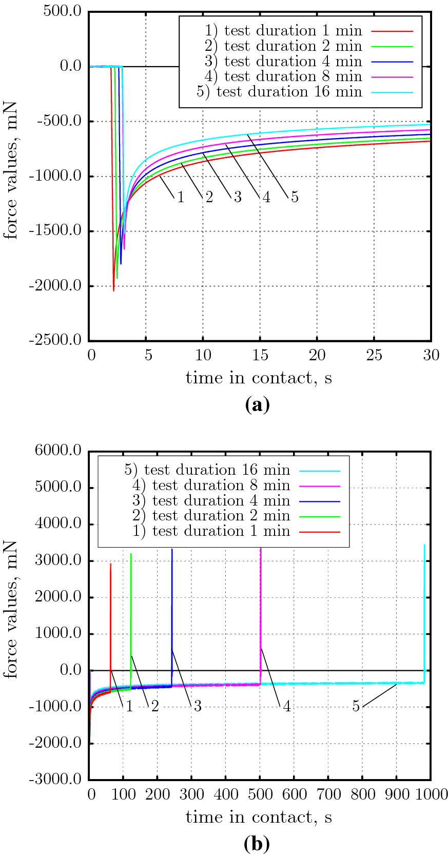 The results of the pull-off tests with progressively increasing duration of contact are presented in Table 2. The results show gradual decrease in the absolute value of maximum compression force (most likely, due to incomplete relaxation of the specimens between tests). However, even despite this fact, clear correlation between the maximum recorded pull-off force and the test duration was observed. That is, adhesion between half-specimens increased as the time in contact grew. Graphically, dependency between the maximum pull-off force and the time in contact is represented in Fig. 4.
