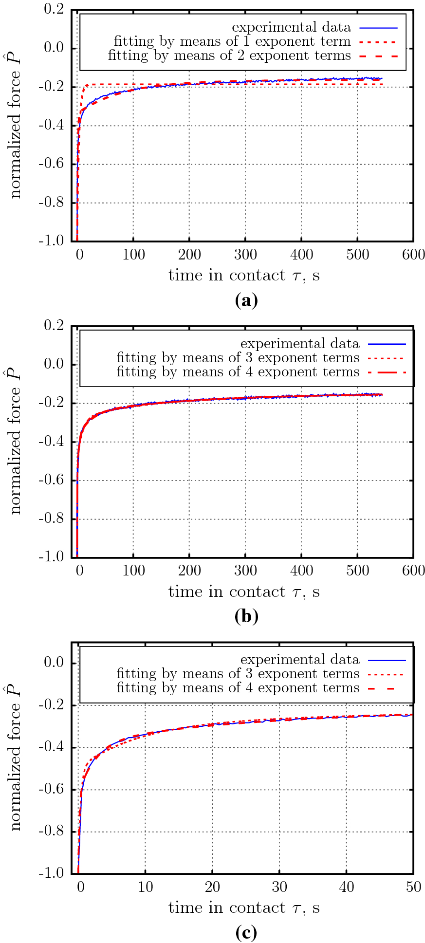 Example results of fitting experimental data using different number of exponent terms. a 1 and 2 terms used; b 3 and 4 exponent terms used, c 3 and 4 exponent terms used, initial loading stage is shown (the density of shown experimental data points was reduced to improve image clarity)