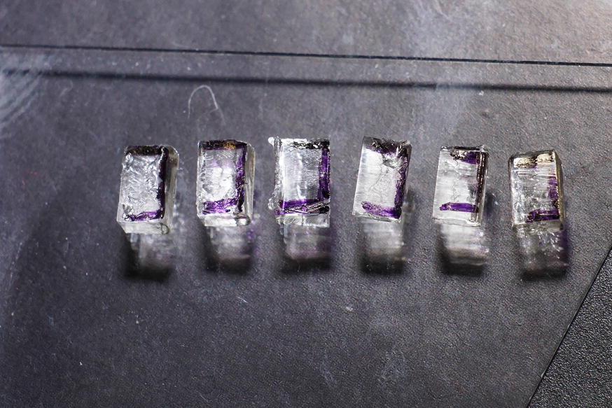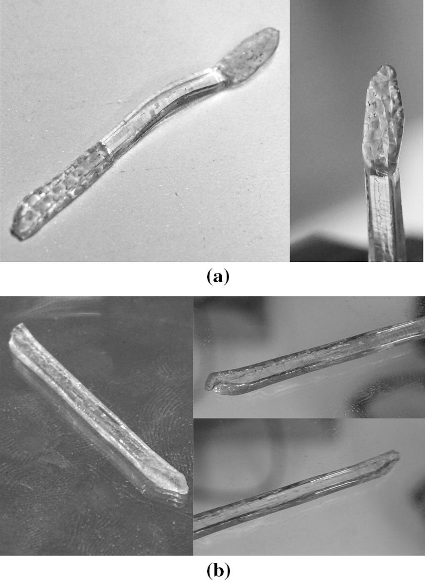 In order to analyze the self-healing ability of the material under non-ideal conditions a number of pull-off tests was carried out. In the tests small prismatic specimens of nominal length 4 mm were used (Fig. 2). The cross-section dimensions of the specimens varied and were not specifically controlled. The tests were performed 9 months after manufacturing the sample.