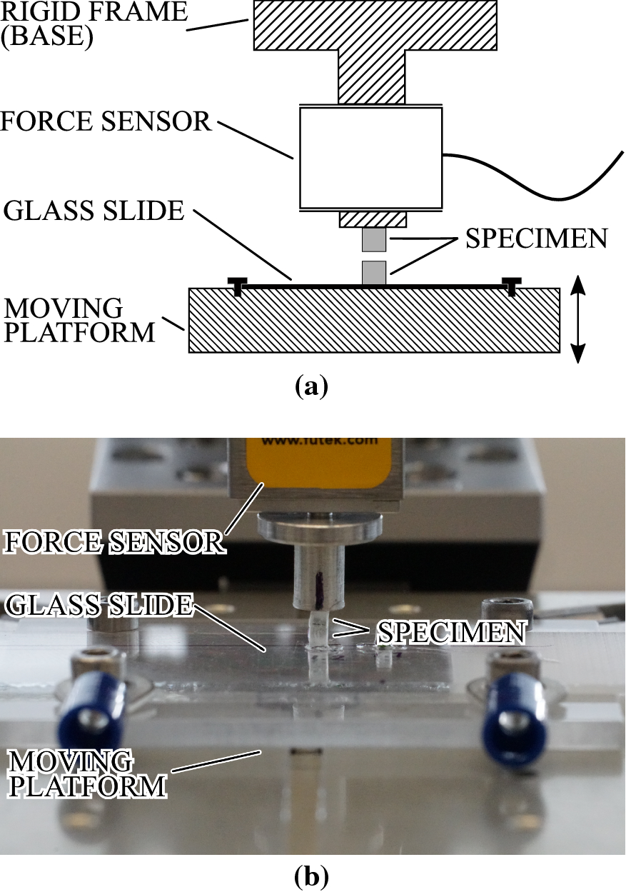 During testing, each specimen was cut in half in the middle using a razorblade. The resulting halves were used in the experimental set-up as shown in Fig. 3. One half of each specimen was attached (glued) via an aluminium stub to the force sensor Futek (FUTEK Advanced Sensor Technology, Inc.). The opposite part of the sensor was attached to the rigid base (metal frame). The other half of each specimen was glued (with Ergo 5925 Elastomer, Tagelswangen, Switzerland) to a glass slide. The latter was firmly attached to a moving metal platform. The platform movement was computer controlled by means of servo-drives through the Hexapod F-206S 6-axis motion controller [Physik Instrumente (PI) GmbH, Karlsruhe, Germany]. The hardware set-up was similar to the one used for adhesion studies in [12].