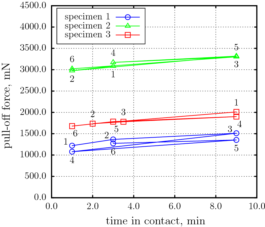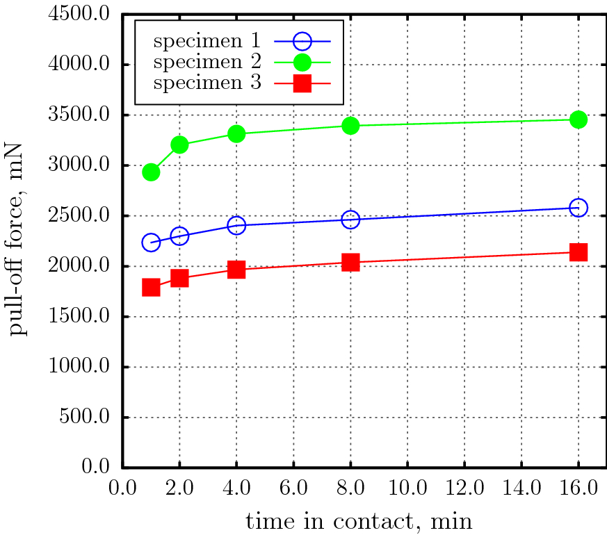 The results of the test series No.2 are presented in Table 3. In graphical form these results are presented in Fig. 5. They clearly show that indeed the longer specimens stayed in contact the higher the pull-off force was regardless of the previous loading history. This kind of time-dependent adhesion demonstrate the ability of the material to repeatedly withstand destruction after being damaged and put together.