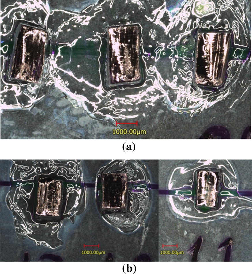 The Smartpol material [4] is a clear soft homogeneous substance (Figs. 1, 2) made of polyurethane with segmented molecular structure of hard and soft segments. In preliminary tests carried out at ADHTECH a metallic wire (1 mm diameter) with 1 kg weight at its end was placed on the middle of rectangular section of a polyurethane specimen (Fig. 1). As the wire cut the polyurethane, the broken area restored its shape and structural integrity of the specimen at room temperature without external influence. To quantitatively characterize this ability another series of preliminary tests was carried out at ADHTECH using the Instron 4411 Universal testing machine (Instron Ltd., Buckinghamshire, UK) and dog-bone shaped specimens with the dimensions required by ISO 37-2 standard. The extent of self-healing was tested by cutting the test sample by the middle and re-joining the two cut pieces immediately after cut in the same location of the cut, and left stand at \(25\,^{\circ }\hbox {C}\) for 24 h. Afterwards, the tensile test was repeated and the mechanical properties were compared. The pulling rate was 50 mm/min. The mechanical properties of the Smartpol specimens before and after being cut are given in Table 1. The results show effective restoration of 83% of the mechanical strength of the material.