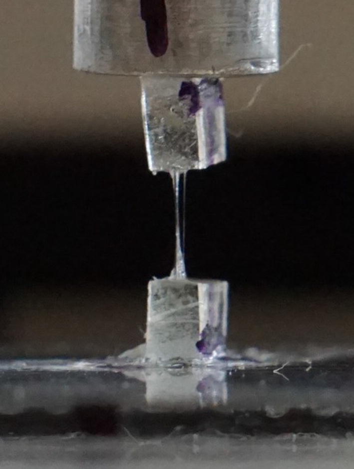 This kind of testing had multiple aims: (1) to confirm growth of adhesion between two pieces of the material with respect to time under non-ideal alignment conditions in a location where it had beed previously damaged (cut); (2) to study the ability of the material to withstand repeated damage in the same location; (3) to confirm the ability of the material to restore its structural integrity (self-healing) and to find out some of the contributing factors.
