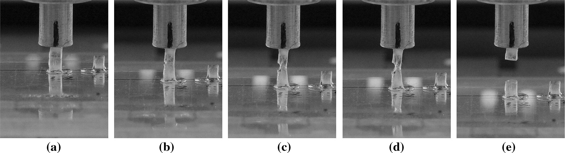 The actual self-healing was observed during pull-off tests (Fig. 7). If the target separation distance was not long enough, the specimen halves did not separate fully as the two pieces of material started restoring its structural integrity during compression phase of the tests.