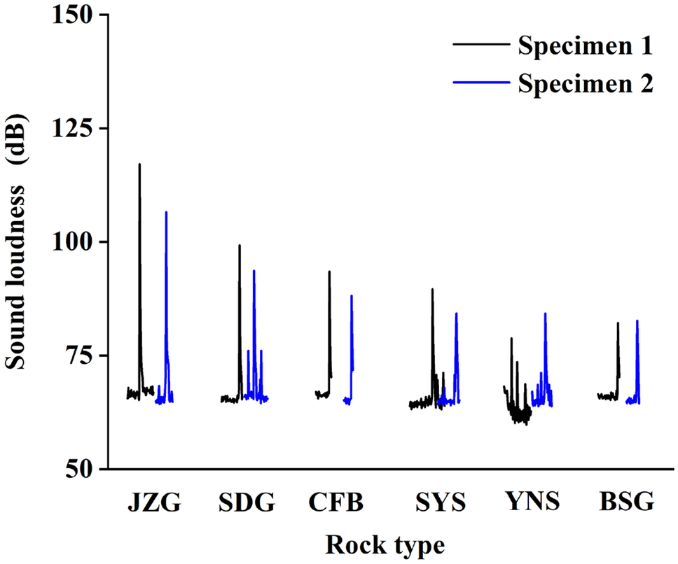 It is believed that the loudness of the sound of rock failure is proportional to the burst intensity of the specimen. The greater the burst intensity, the louder the sound. Therefore, the loudness of the sounds during rock failure in laboratory tests can be used to express the intensity of the strainburst (Su et al. 2017a). The sounds of all specimens recorded at the time of rock failure are represented in Fig. 10. The threshold used for the sound records was 63.5 dB. This guaranteed that ambient noises would not affect the recordings. The highest pulse signals corresponded to the bursts at rock failure. The average loudness of the sound pulses for the six rock types were 111.9 dB for JZG, 96.5 dB for SDG, 90.9 dB for CFB, 87.0 dB for SYS, 83 dB for YNS, and 82.5 dB for BSG. Among the six rock types, the sound loudness was greatest for Jinzhou granite and least for Beishan granite. This means that the intensity of the strainburst was highest in the former and lowest in the latter. It is important to note that the sound loudness was increased somewhat by sound from the testing machine, and this was proportional to the ultimate stress on the specimens. It is more convincing to compare the sound loudness of rock types, the strengths of which are similar. Among the six rock types, the peak stresses of the rocks JZG, SDG, and CFB were similar in the range from 310 to 340 MPa. The descending order of sound loudness for those three rock types was JZG, SDG, and CFB, which was consistent with the order in the intrinsic strainburst ejection velocity as shown in Fig. 9b. Similarly, the peak stresses of SYS and BSG were similar around 250 MPa. The sound loudness of SYS was higher than that of BSG, and their intrinsic strainburst ejection velocities were in the same order. In summary, the loudness of the sound pulses during rock failure is a measure of the burst intensity, particularly when the rock strengths are at approximately the same levels. As a comparison of Fig. 10 with Fig. 9b shows, the order of sound loudness of the six rock types was consistent with the order in the intrinsic ejection velocity.